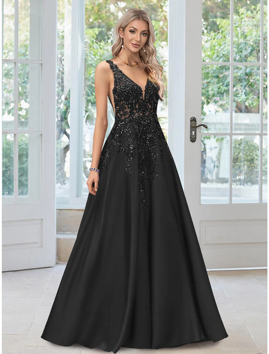 A-Line Evening Gown Floral Dress Formal Black Tie Floor Length Sleeveless V Neck Lace with Appliques