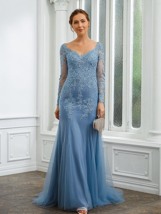 Sheath/Column Tulle Applique V-neck Long Sleeves Sweep/Brush Train Mother of the Bride Dresses