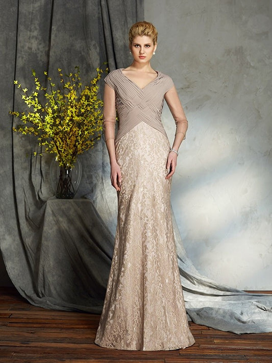 Sheath/Column V-neck Lace Short Sleeves Long Chiffon Mother of the Bride Dresses