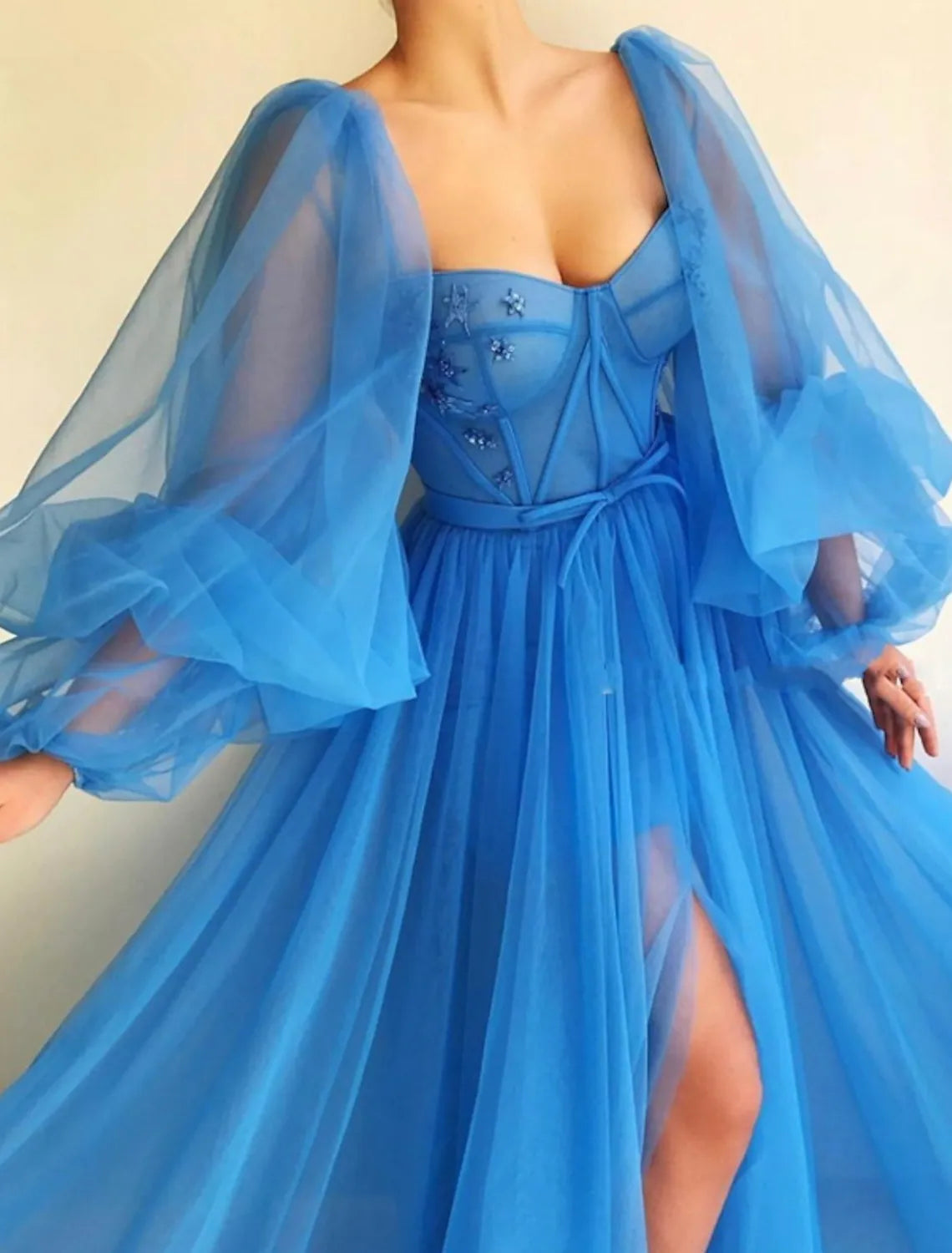 A-Line Corsets Luxurious Elegant Engagement Formal Evening Birthday Dress Scoop Neck Long Sleeve Sweep / Brush Train Tulle with Pleats Slit