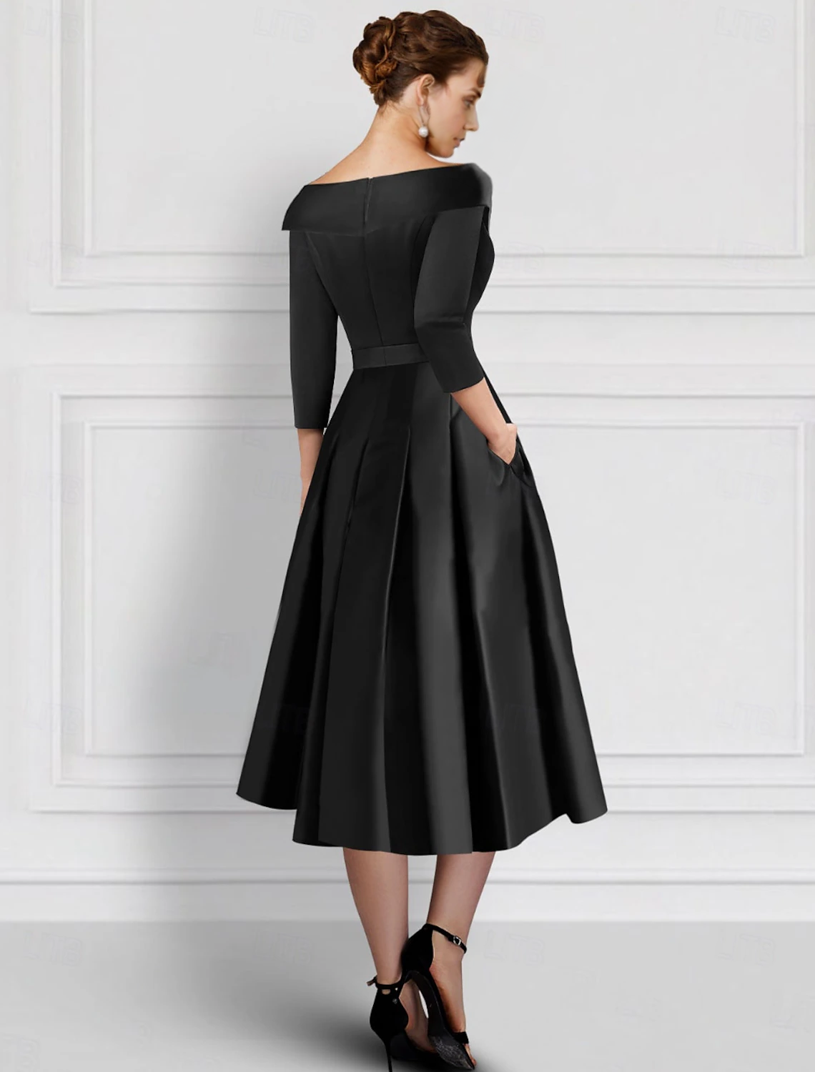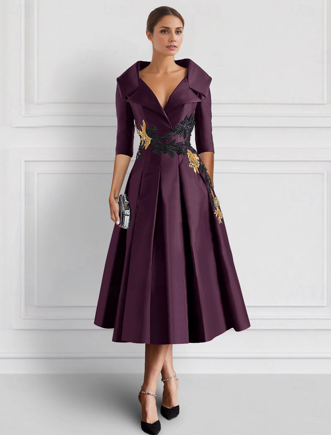 A-Line Dress Mother of the Groom / Bride Dress High Split Shirt Collar Ankle Length Satin Length Sleeve with Appliques Formal Elegant Fall November Wedding Guest Dress