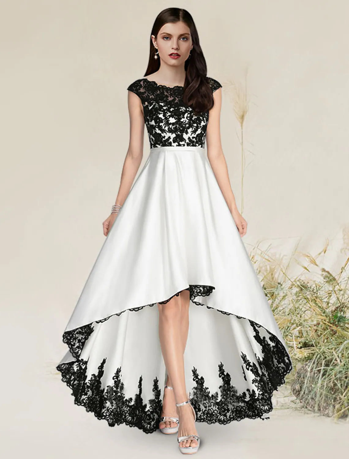 A-Line Elegant Engagement Formal Evening Dress Jewel Neck Sleeveless Asymmetrical Satin with Appliques