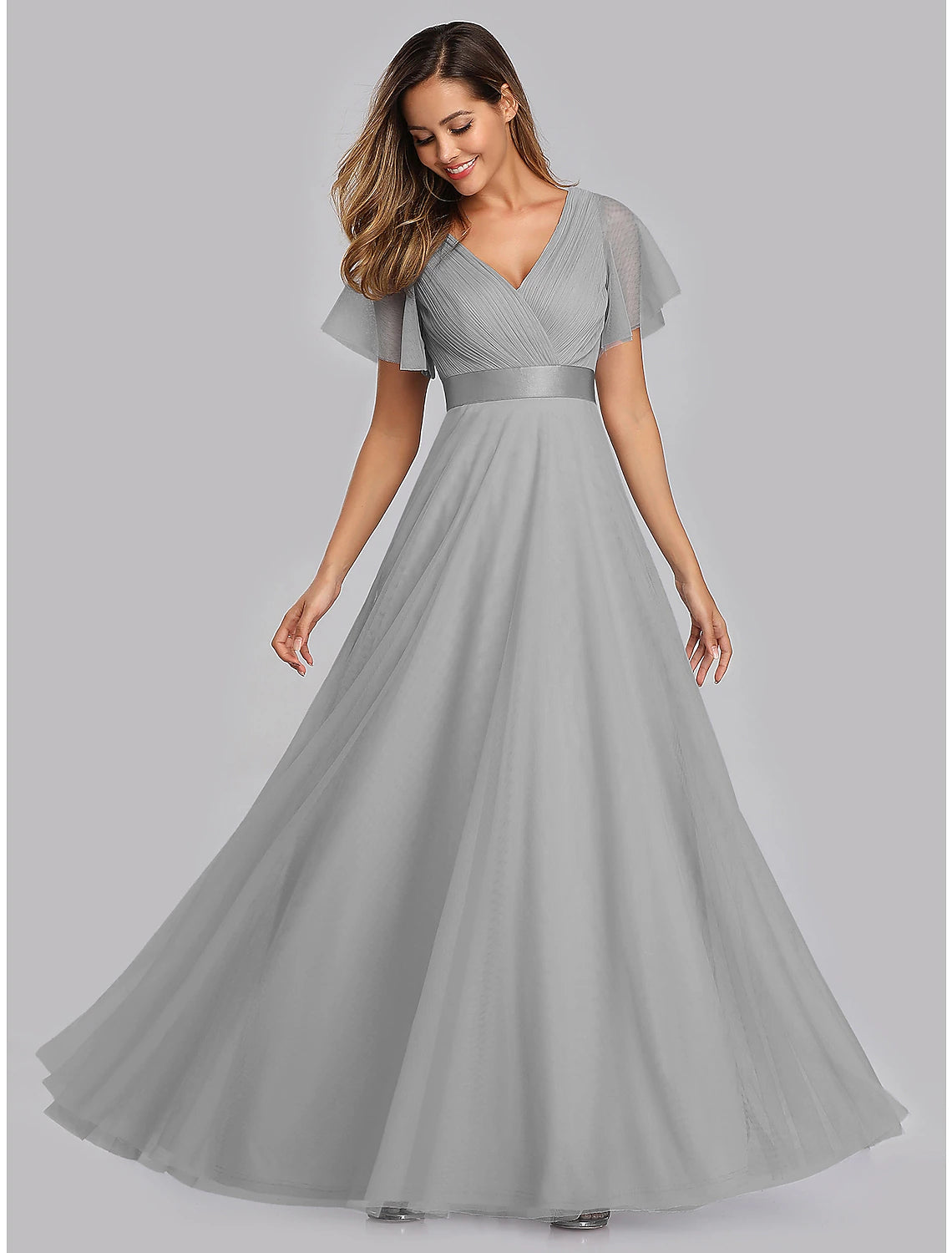 A-Line Empire Wedding Guest Prom Dress V Neck V Back Short Sleeve Floor Length Chiffon with Pleats Ruched