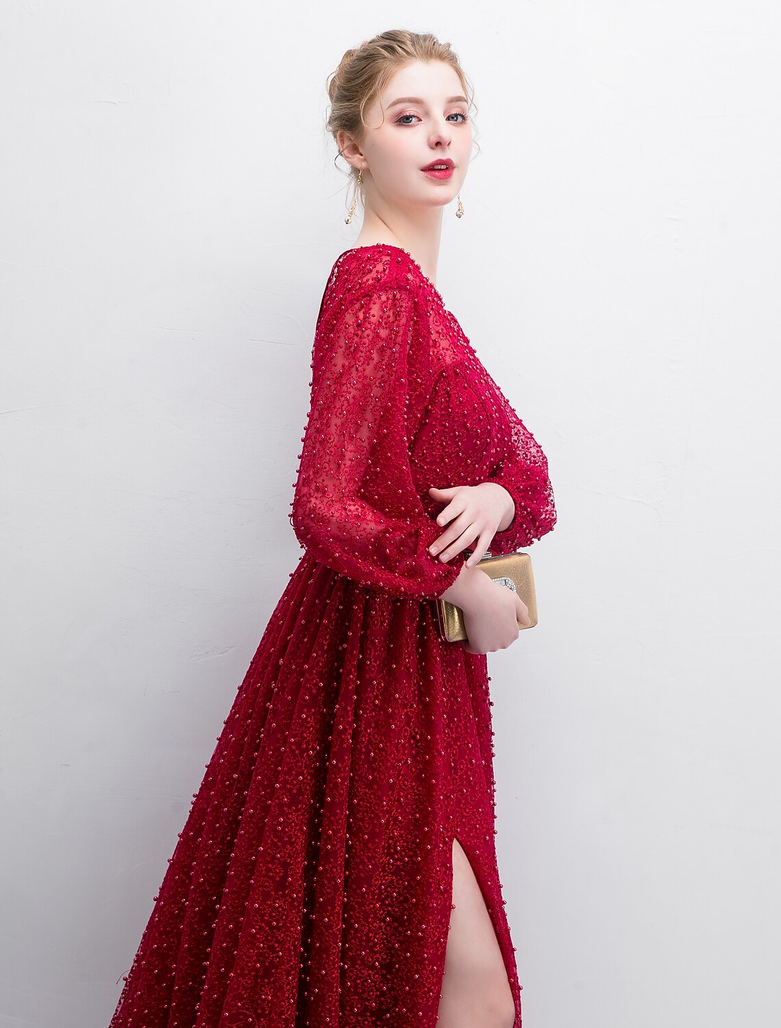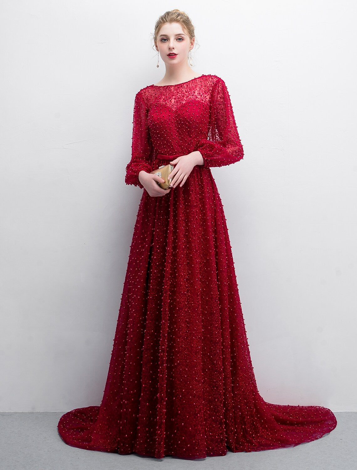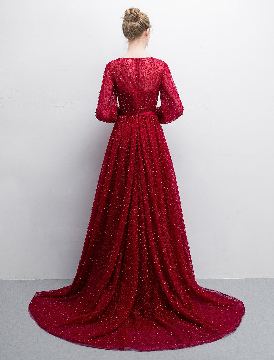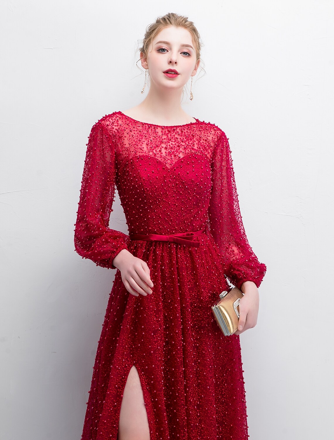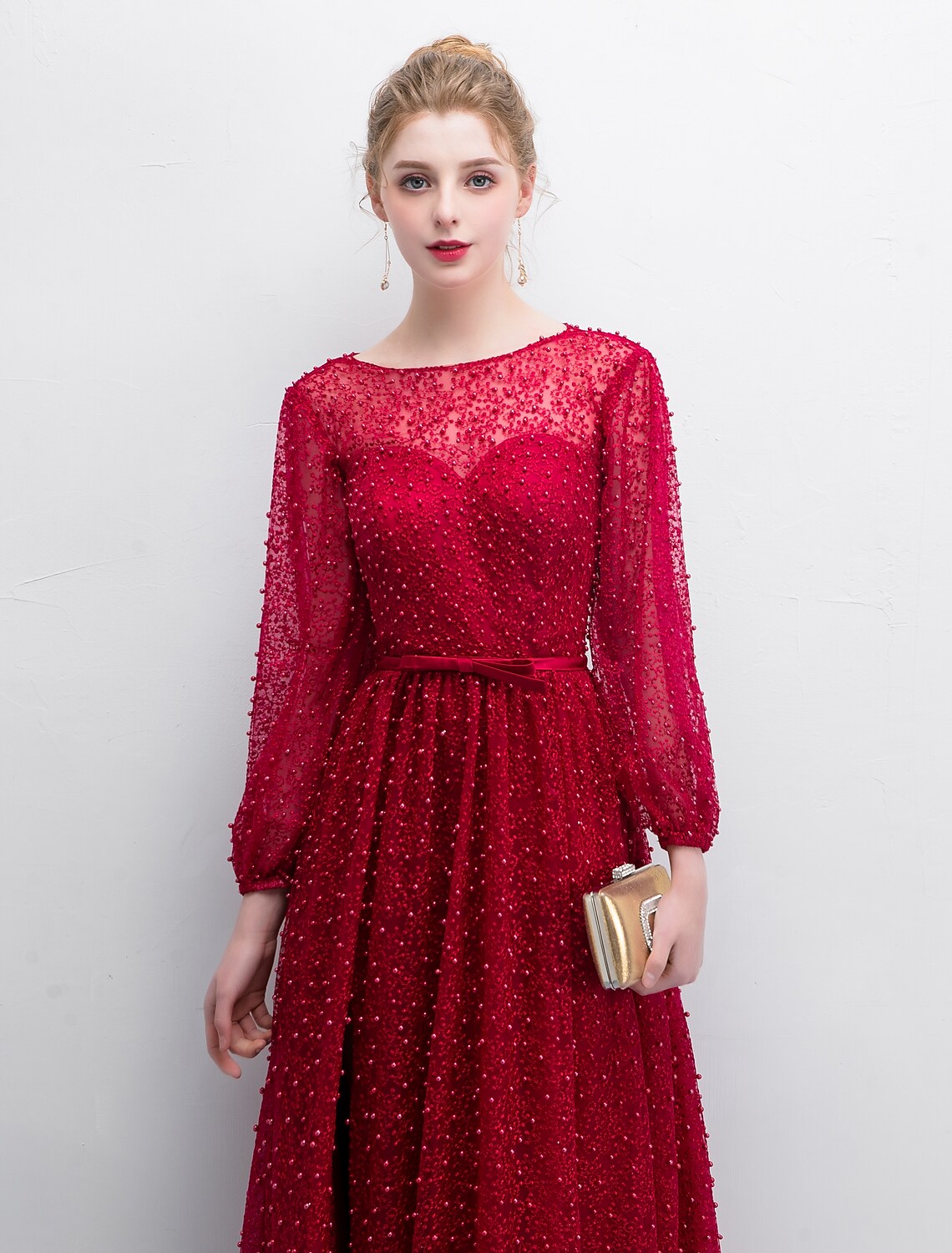 A-Line Evening Gown Elegant & Luxurious Dress Formal Evening Sweep / Brush Train Long Sleeve Boat Neck Lace with Sash / Ribbon Split Front