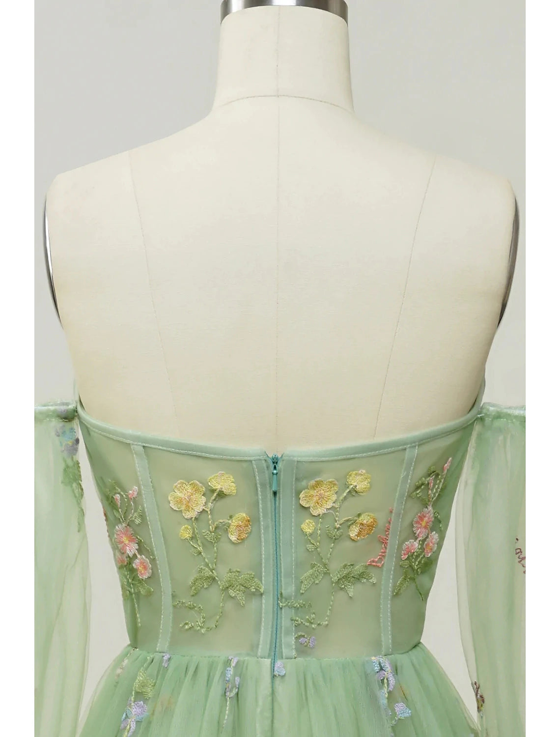 A-Line Evening Gown Floral Dress Formal Floor Length Long Sleeve Sweetheart Lace Backless with Pleats Appliques