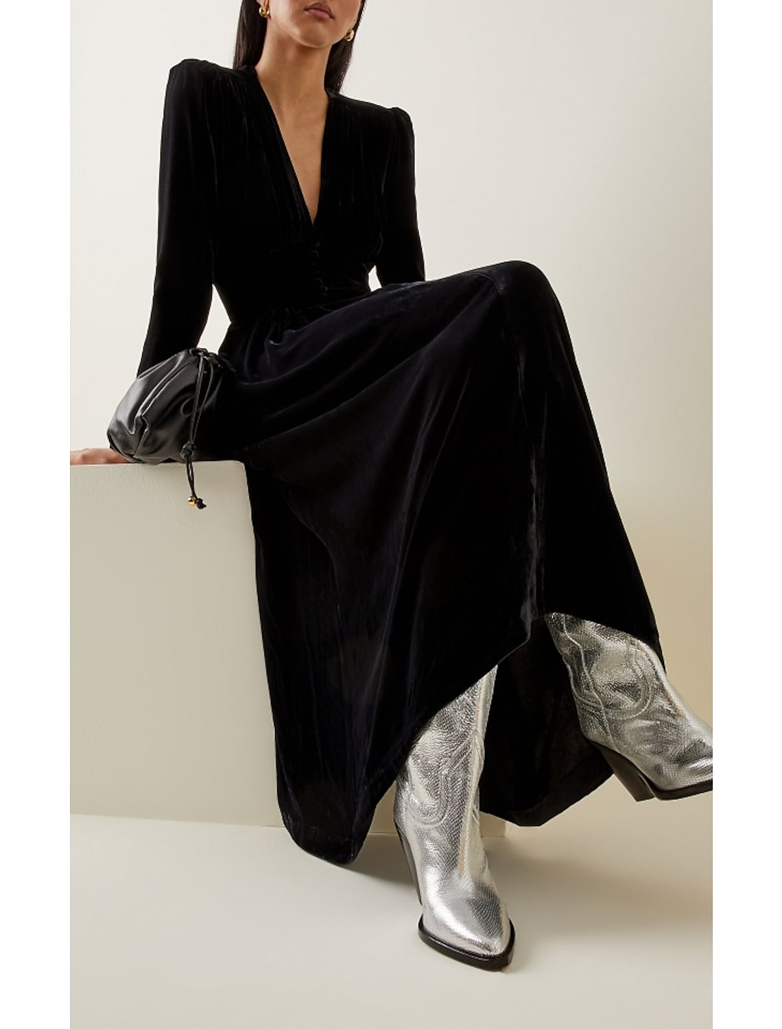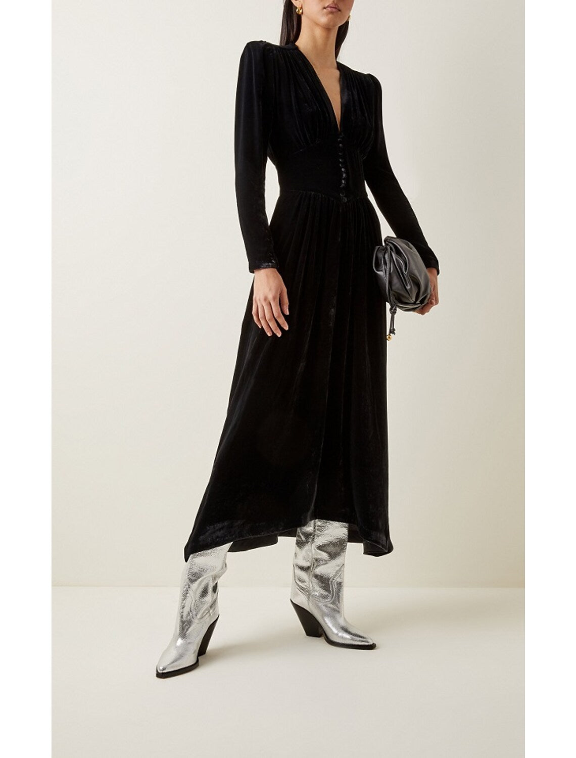 A-Line Evening Gown Minimalist Dress Wedding Guest Ankle Length Long Sleeve V Neck Velvet with Buttons Pleats