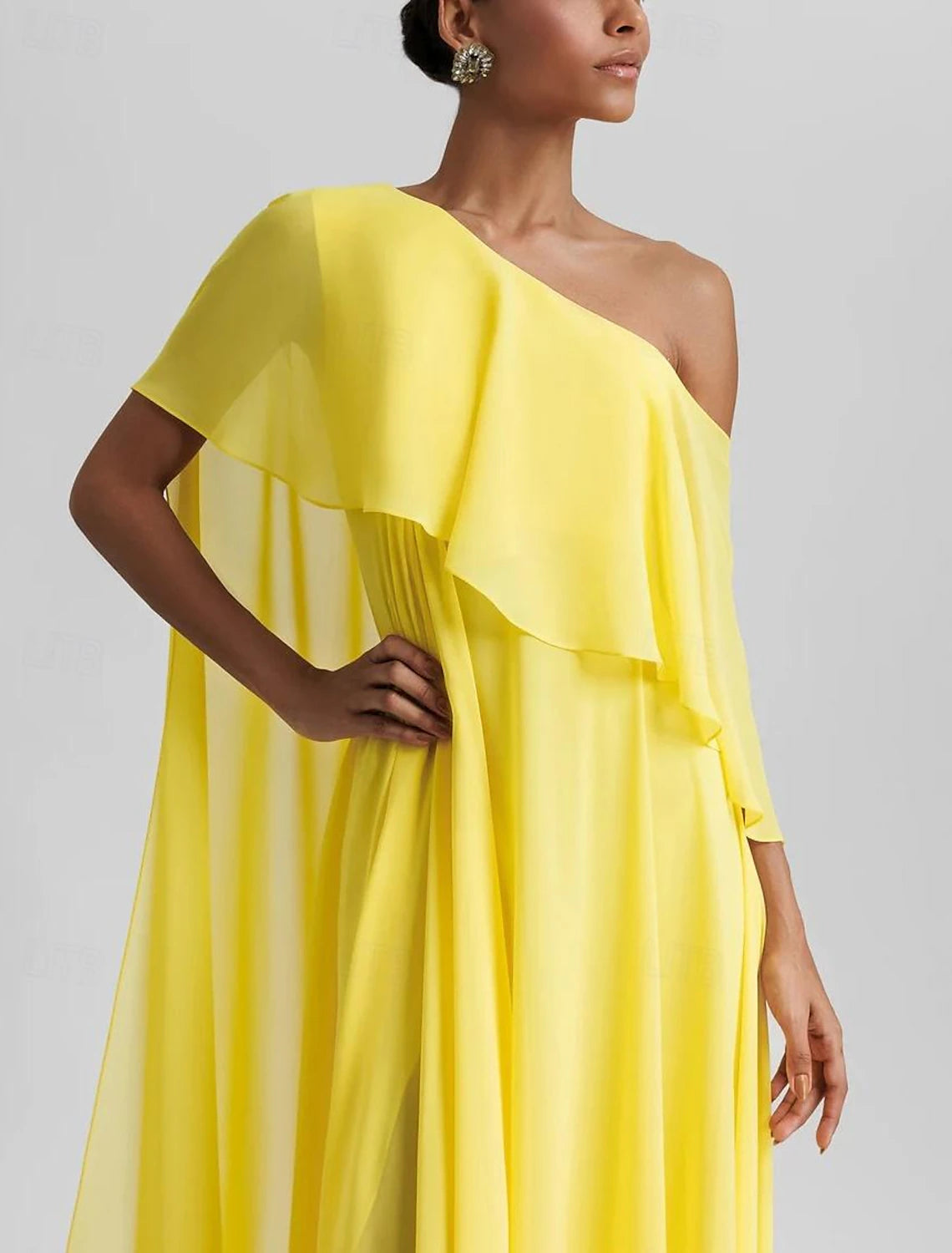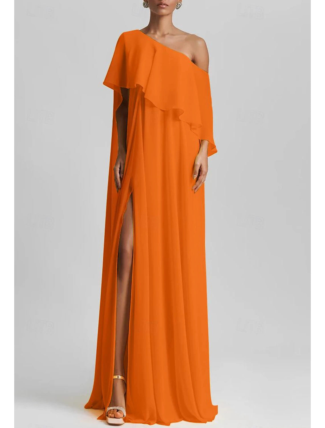 A-Line Gown Elegant Formal Wedding Guest Floor Length Sleeveless One Shoulder Stretch Chiffon with Ruffles Slit Evening Dress