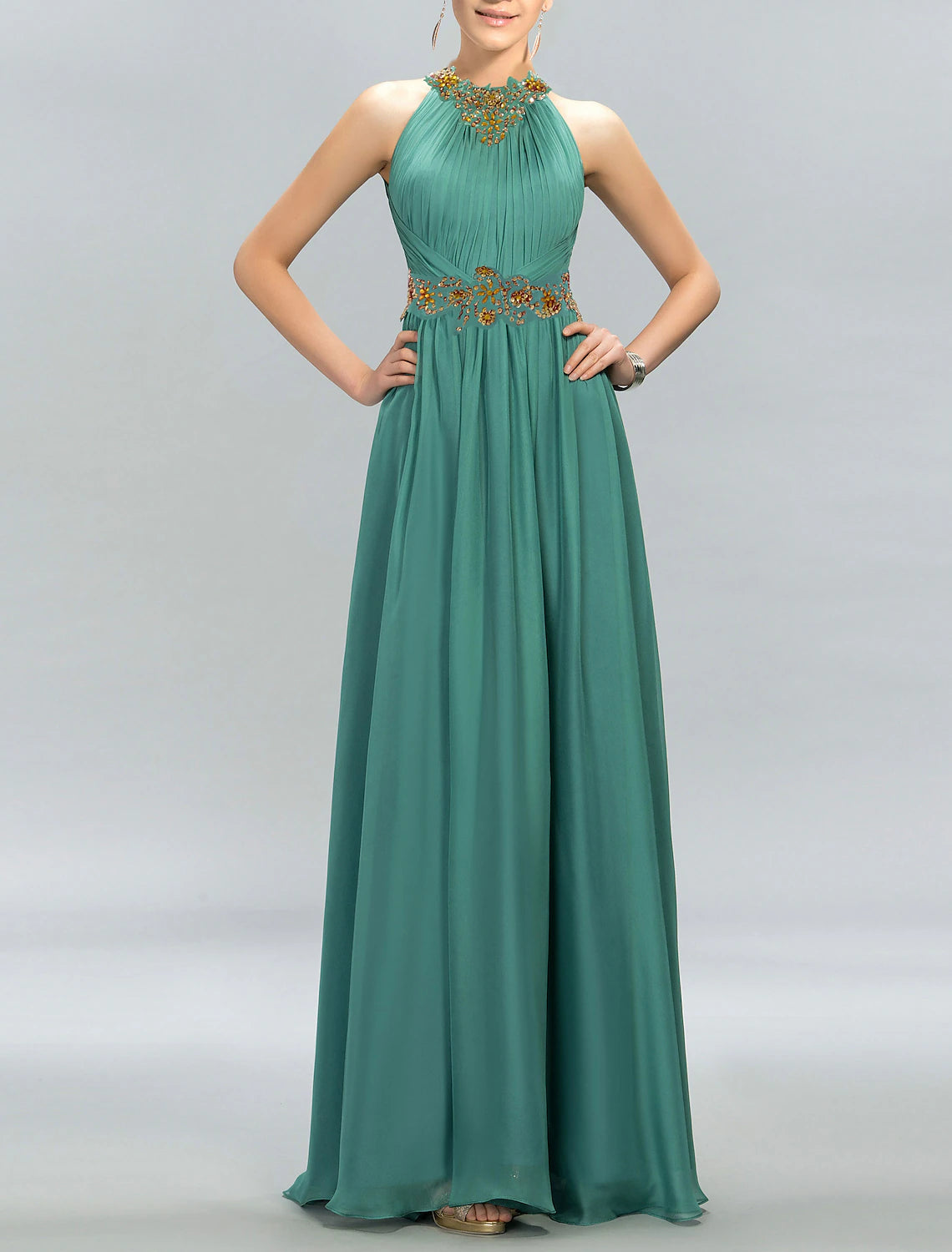 A-Line Minimalist Sparkle Wedding Guest Formal Evening Dress Halter Neck Sleeveless Floor Length Chiffon with Pleats Crystals