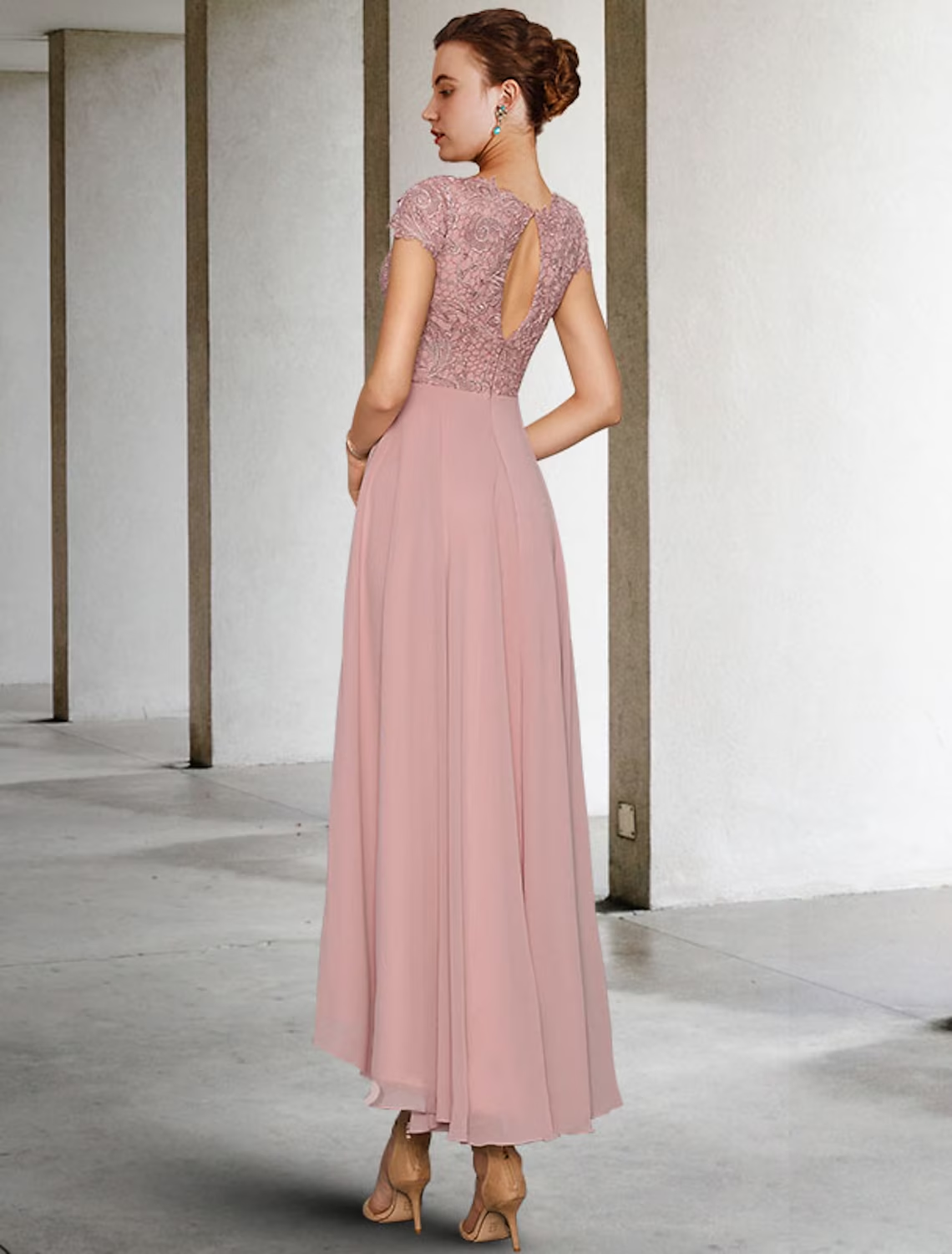A-Line Mother of the Bride Dress Elegant High Low Jewel Neck Asymmetrical Tea Length Chiffon Lace Cap Sleeve with Appliques Ruching
