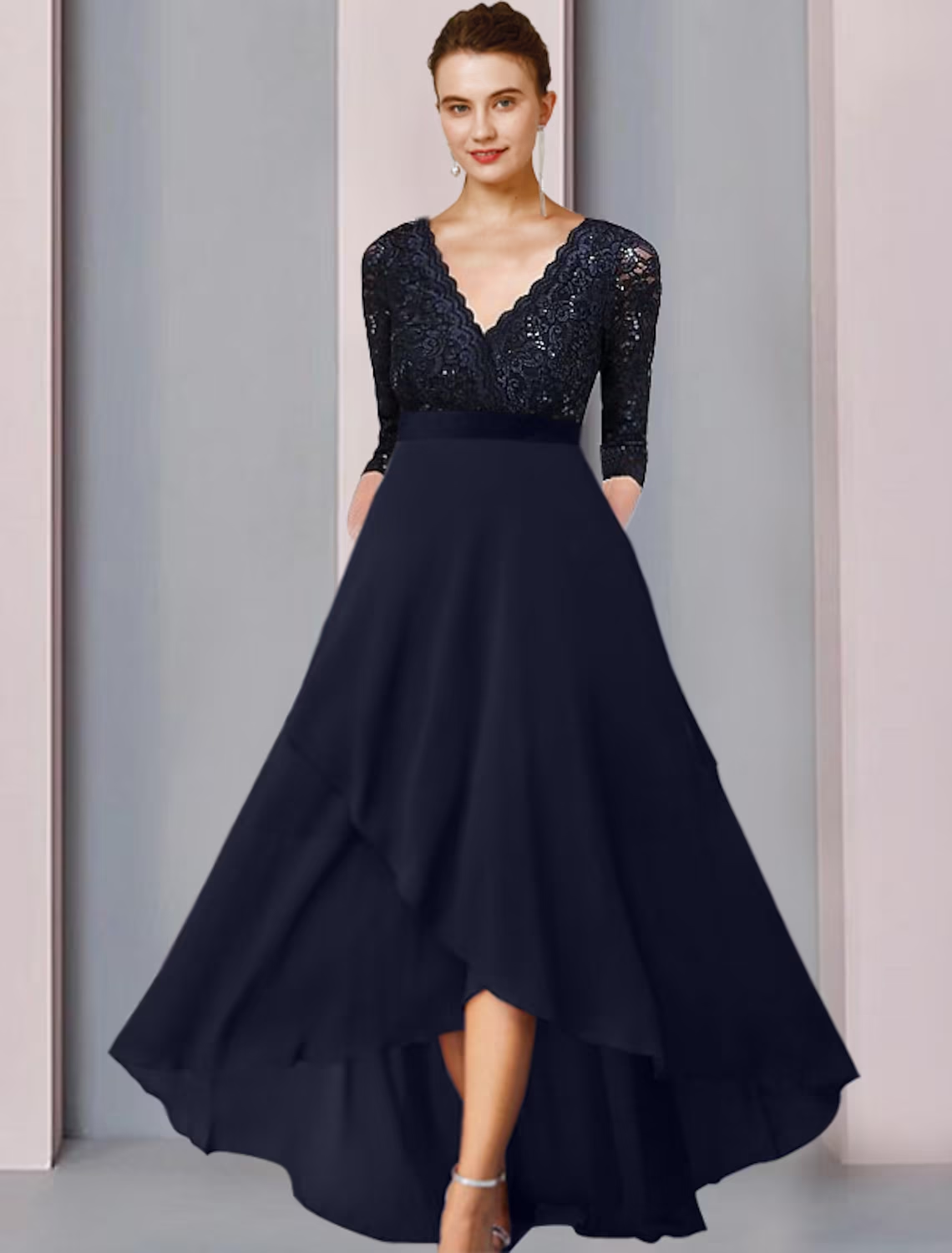 A-Line Mother of the Bride Dress Elegant High Low V Neck Asymmetrical Tea Length Chiffon Lace 3/4 Length Sleeve with Sequin
