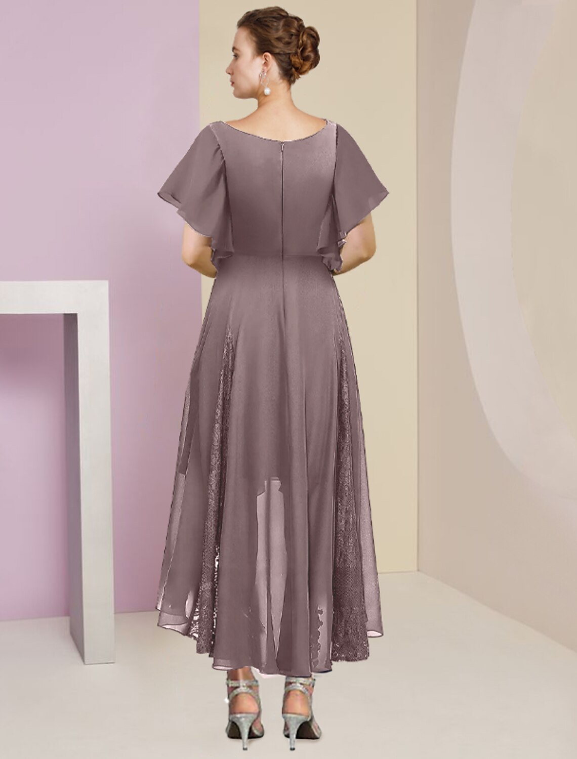 A-Line Mother of the Bride Dress Formal Wedding Guest Elegant V Neck Ankle Length Chiffon Lace Short Sleeve with Pleats Crystal Brooch