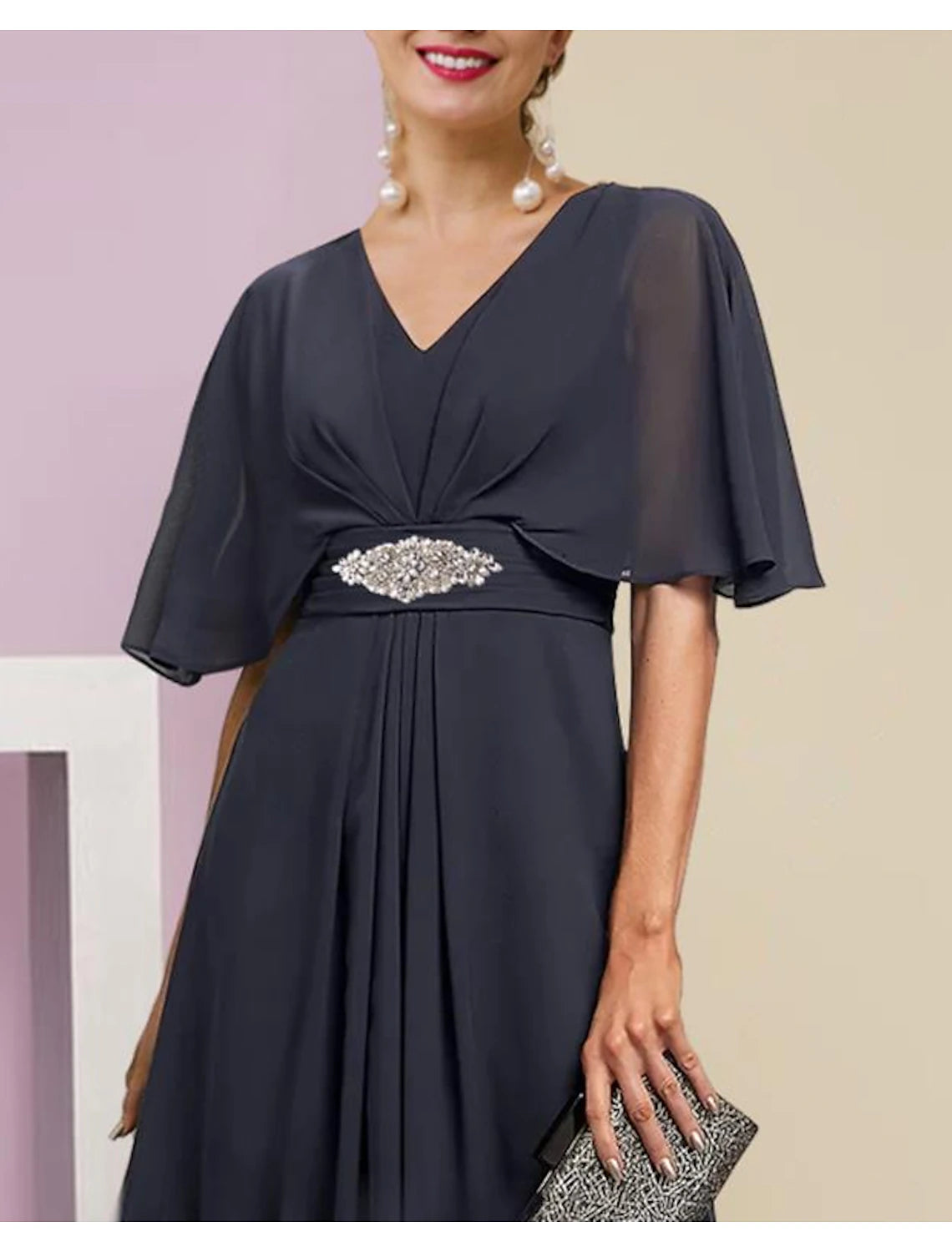 A-Line Mother of the Bride Dress Formal Wedding Guest Elegant V Neck Tea Length Chiffon Lace Half Sleeve with Appliques Crystal Brooch