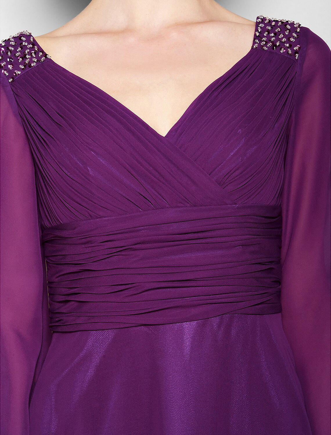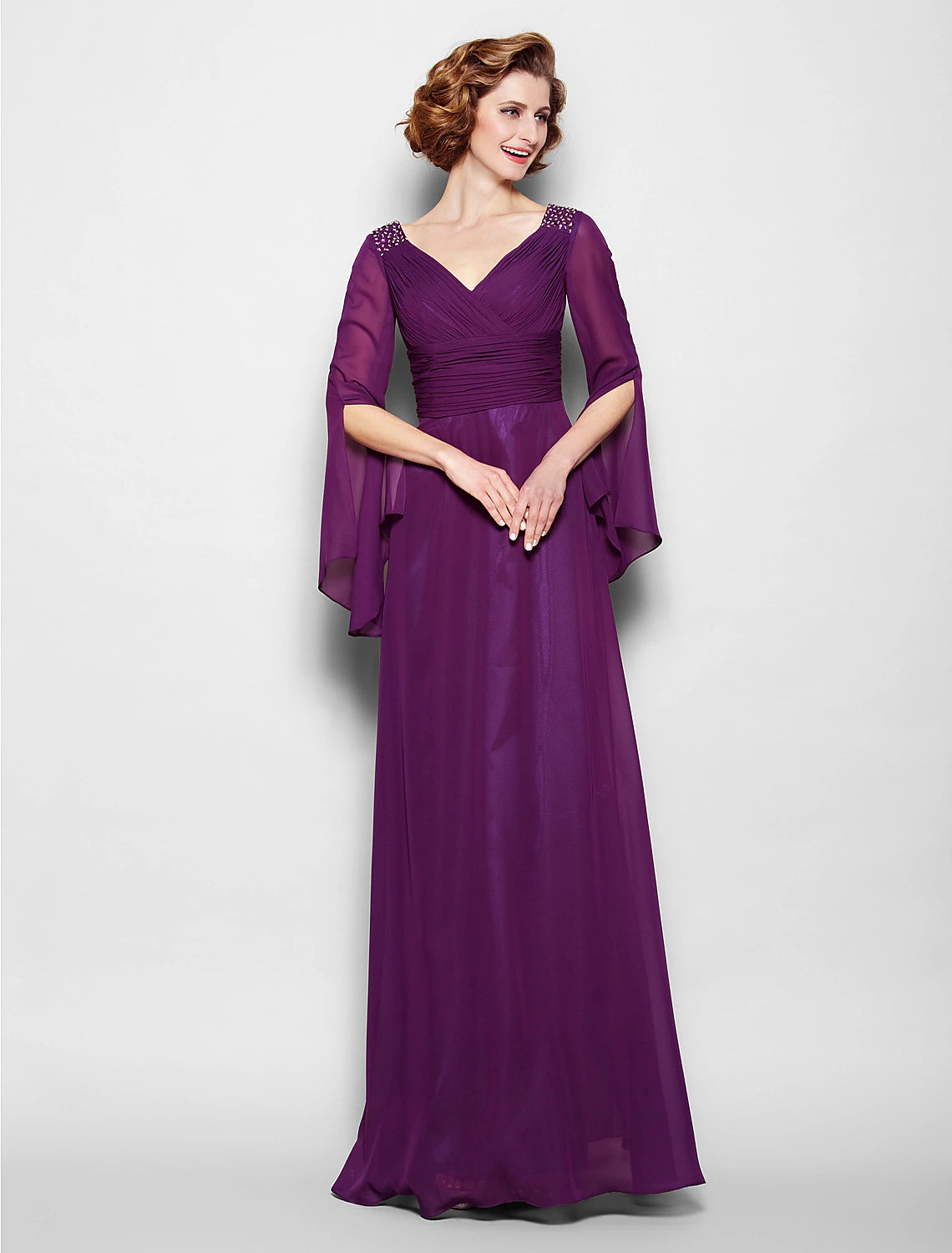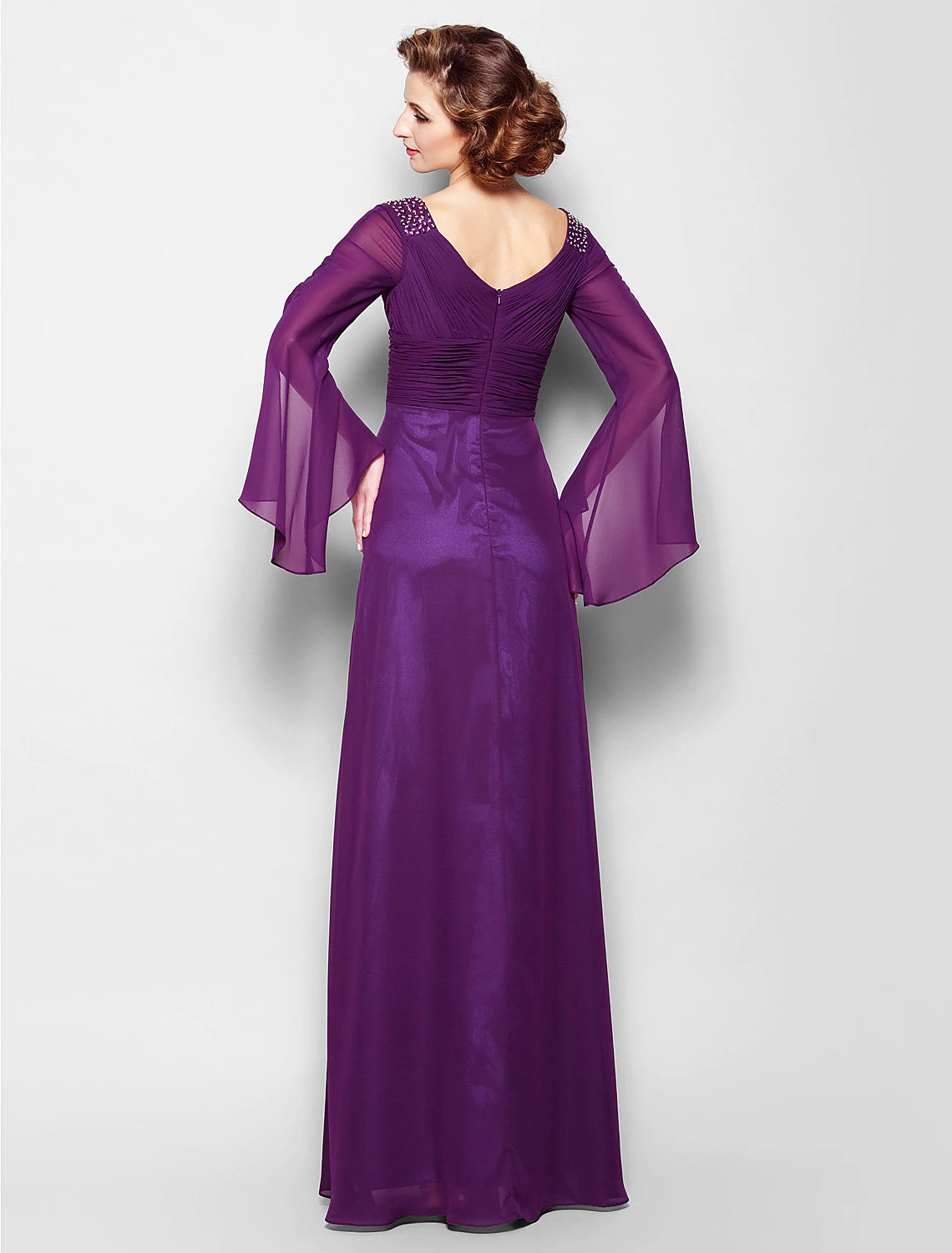 A-Line Mother of the Bride Dress Vintage Inspired V Neck Floor Length Chiffon Long Sleeve No with Criss Cross Ruched Beading