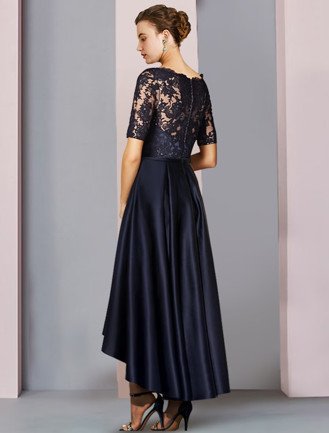 A-Line Mother of the Bride Dress Wedding Guest Elegant High Low Scoop Neck Asymmetrical Tea Length Satin Lace Short Sleeve with Bow(s) Pleats Appliques