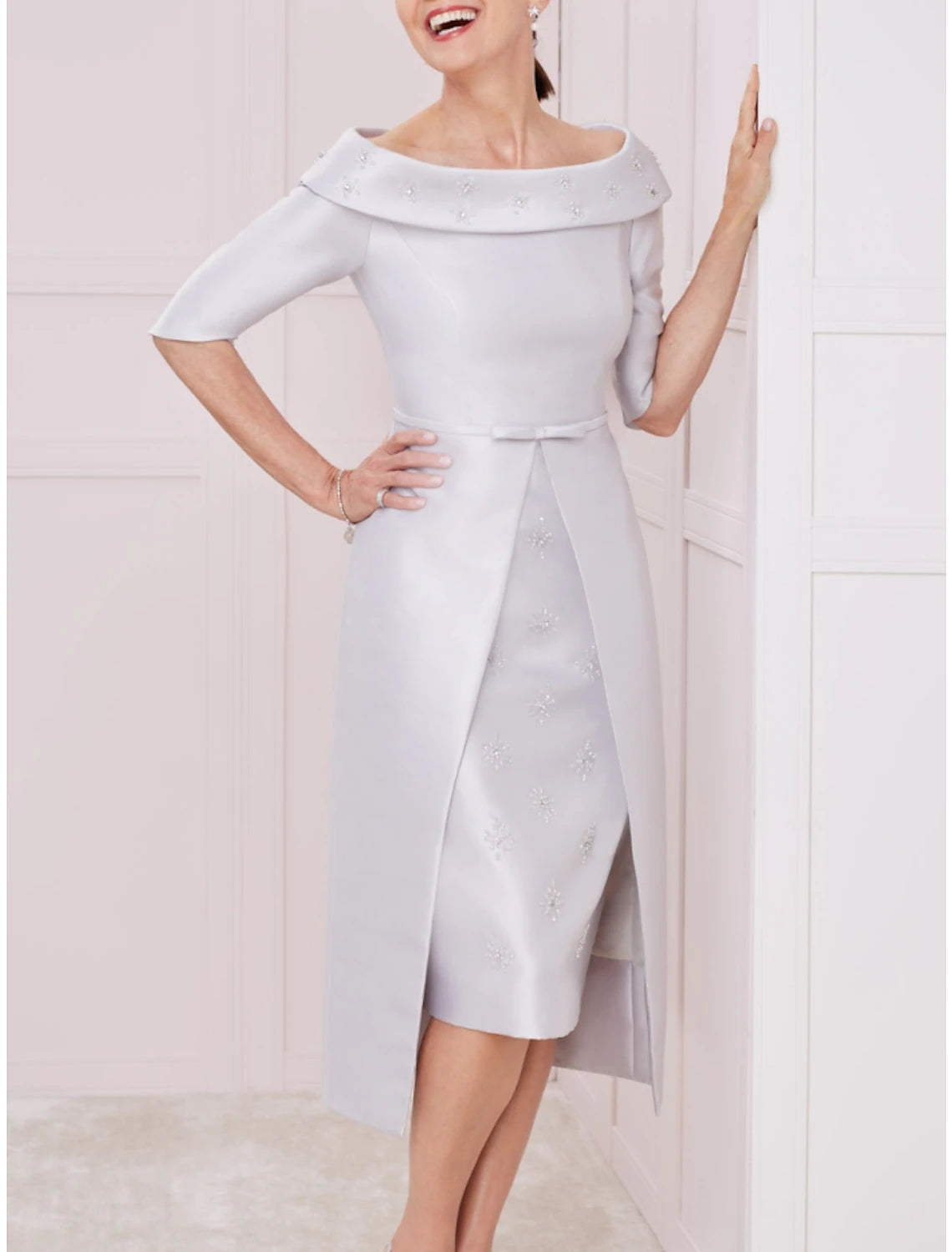 A-Line Mother of the Bride Dress Wedding Guest Elegant Petite Scoop Neck Tea Length Imitated Silk Half Sleeve with Bow(s) Sequin