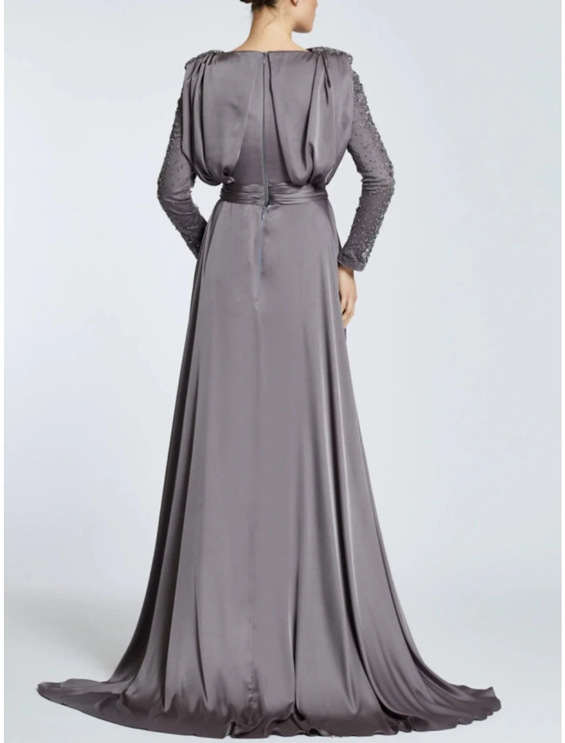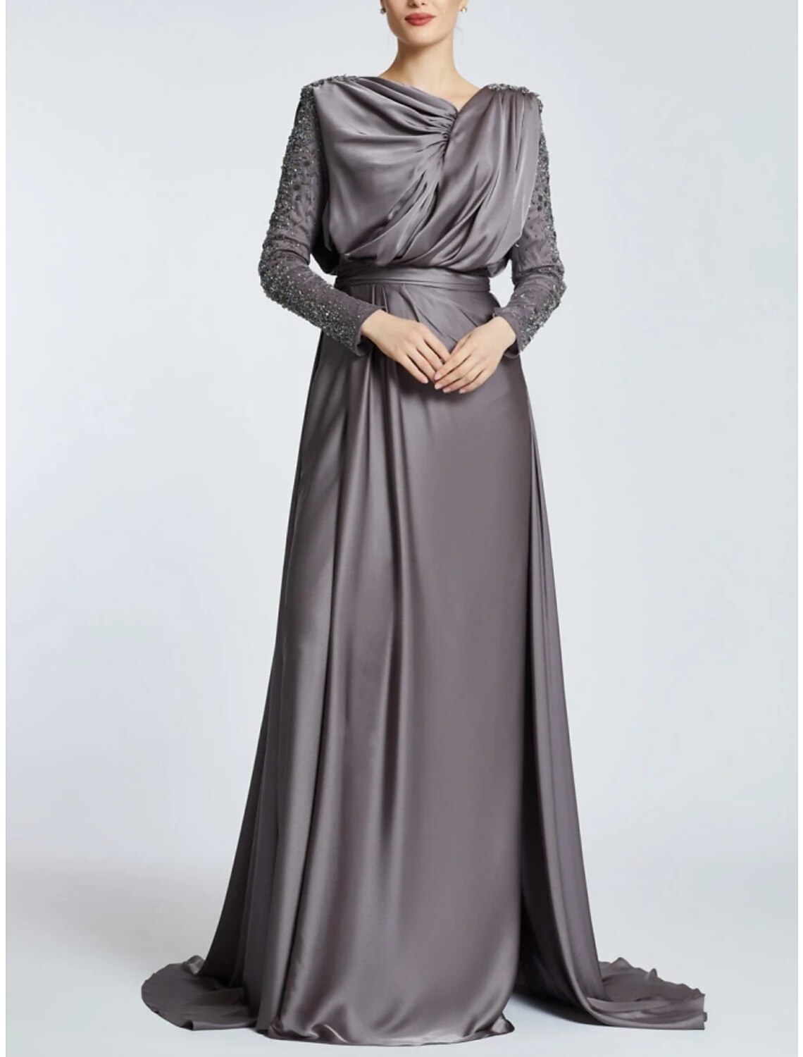 A-Line Mother of the Bride Dress Wedding Guest Elegant Scoop Neck Sweep / Brush Train Satin Long Sleeve with Sequin Ruching