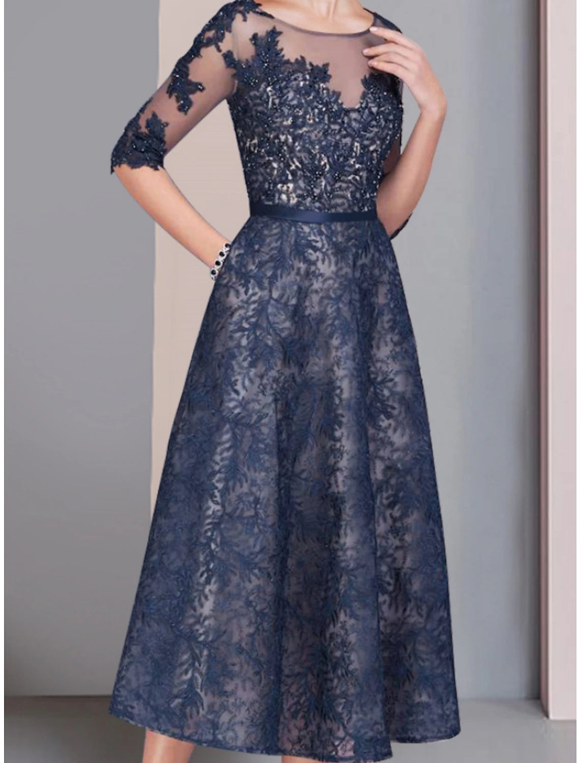A-Line Mother of the Bride Dress Wedding Guest Elegant Scoop Neck Tea Length Lace Half Sleeve with Ruching Solid Color