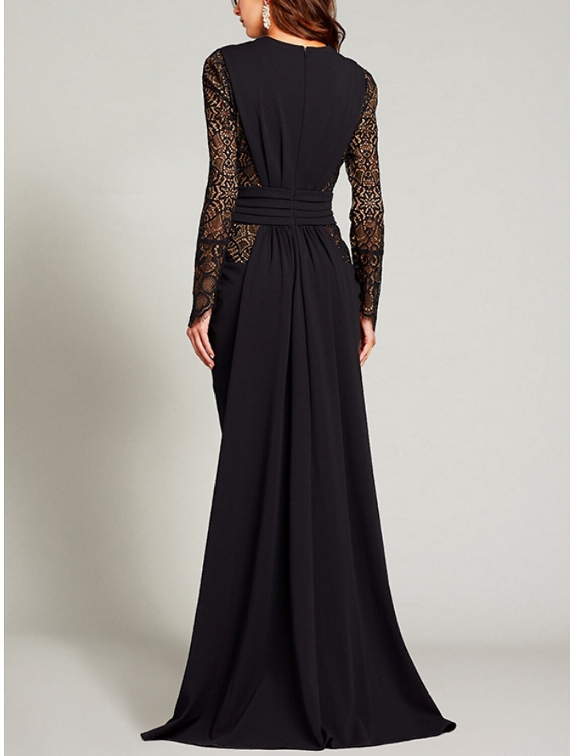 A-Line Mother of the Bride Dress Wedding Guest Elegant V Neck Floor Length Stretch Chiffon Long Sleeve with Lace Split Front