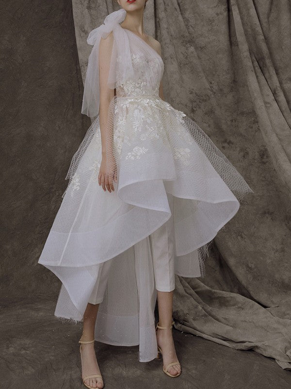 A-Line/Princess Tulle Lace One-Shoulder Sleeveless Asymmetrical Wedding Dresses