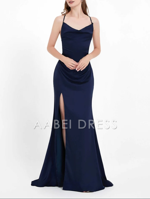 AABEI DRESS Charming Sheath Cowl neck Spaghetti Straps Backless Lace up Side Slit Dress Sweep Train Simple Evening Dress