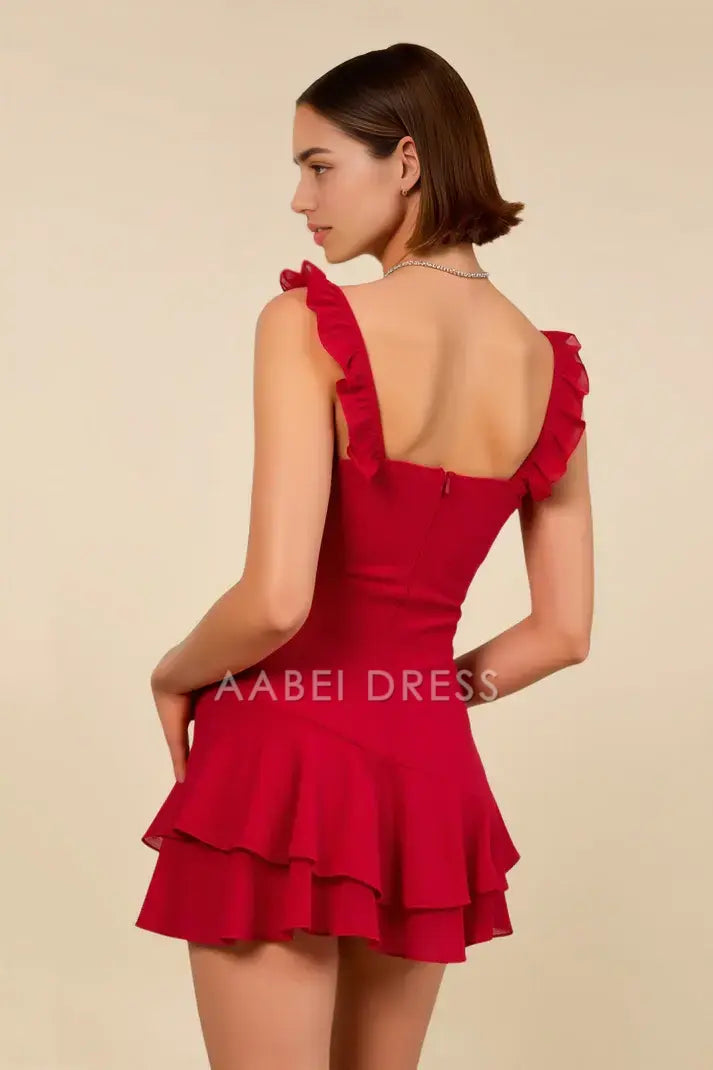 AABEI DRESS For Women Short Prom Dress Chic Sheath V Neck Ruffles Wide Shoulder Straps Tiered Ruffles Cute Mini Dress Hot Sale Homecoming Dress
