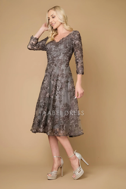 AABEI DRESS Formal Wear Dresse Fashion V Neck 3/4 Sleeve Lace Tea-Length Exquisite Mother Of The Bride Dress