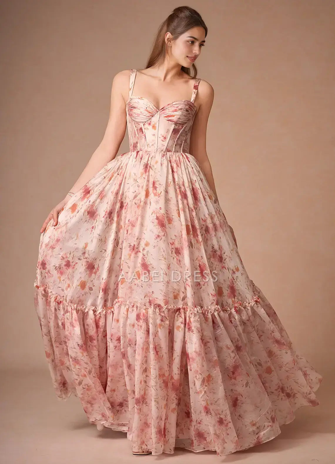 AABEI DRESS Formal Wear Dresses Floral Print A Line Sweetheart Neckline Wide Shoulder Straps Pleated Bodice Romantic Charming Party Dress Hot Sale Prom Dress