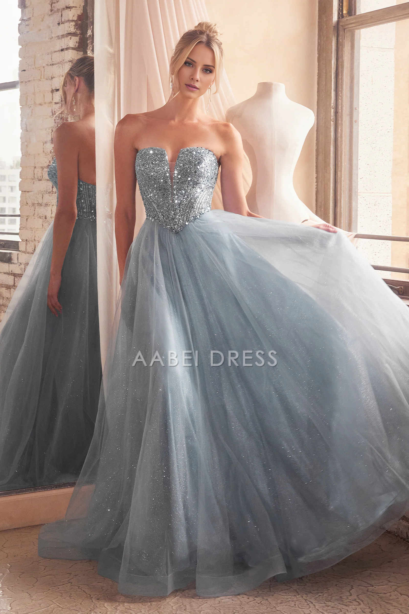 AABEI DRESS Hot Sale Prom Dress Fantastic A Line Strapless Illusion V-Neck Bodice Open Lace-Up Back Sparkle Long Evening Dress