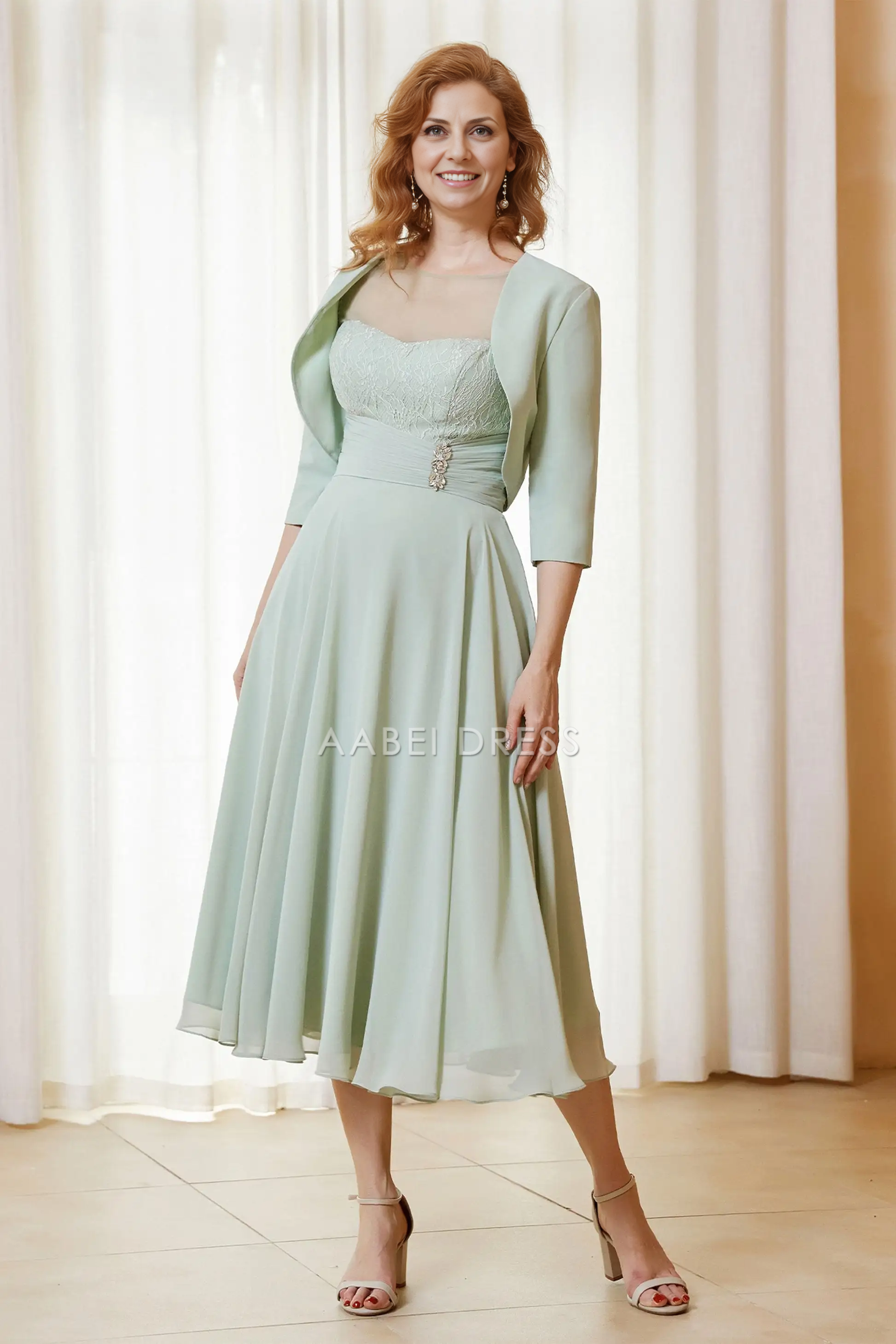 AABEI DRESS Wedding Guests Dresses Fashion A-Line Sweetheart Neckline with Jacket Two-Piece Set 3/4 Sleeves Lace Bodice Pleated Waist Chiffon Dress Elegant Mother of the Bride Dress