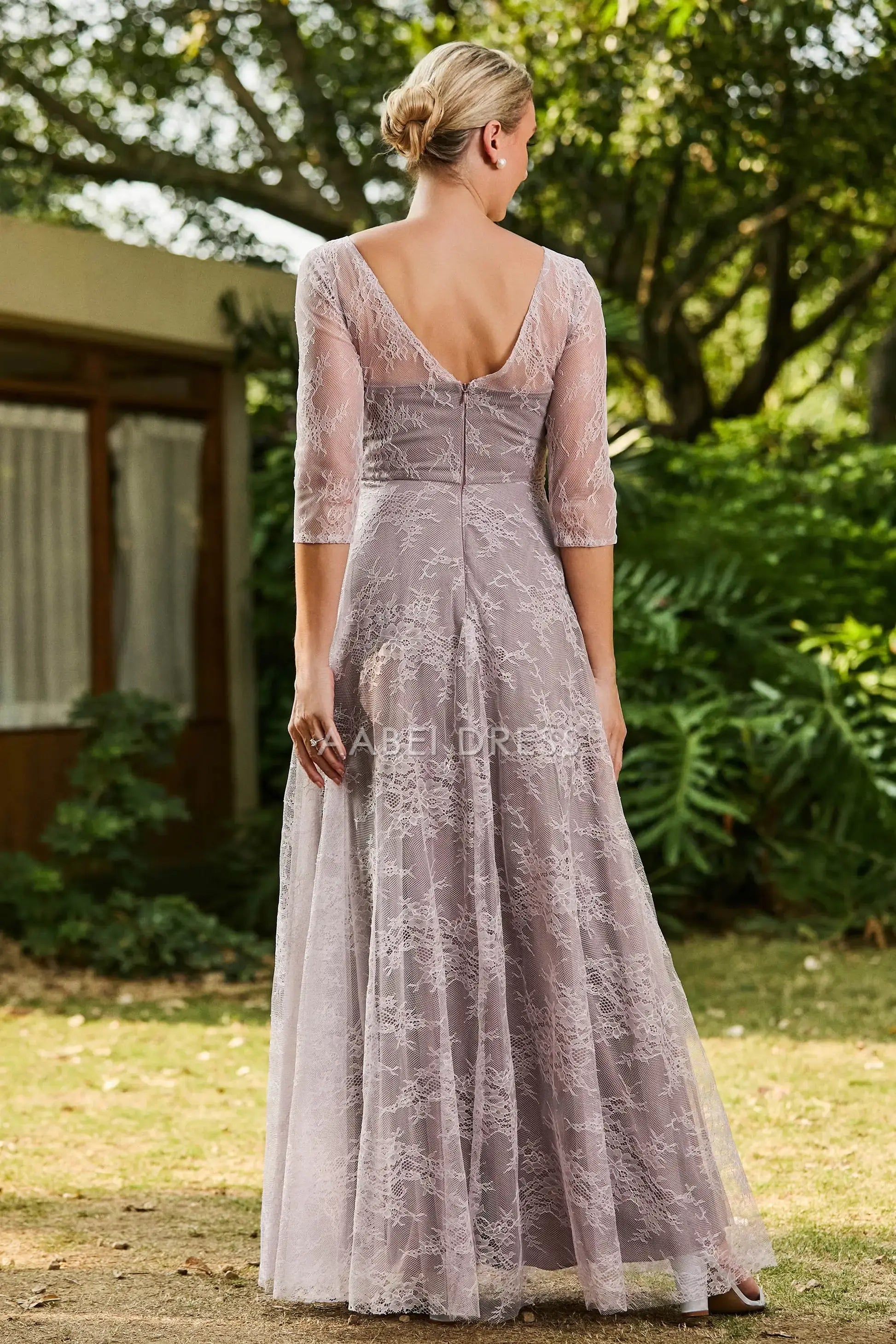 AABEI DRESS Wedding Guests Dresses Mom's Formal Dress A-Line Boat Collar 3/4 Sleeves Lace Ruched Long Dress Elegant Retro Mother of the Bride Dress