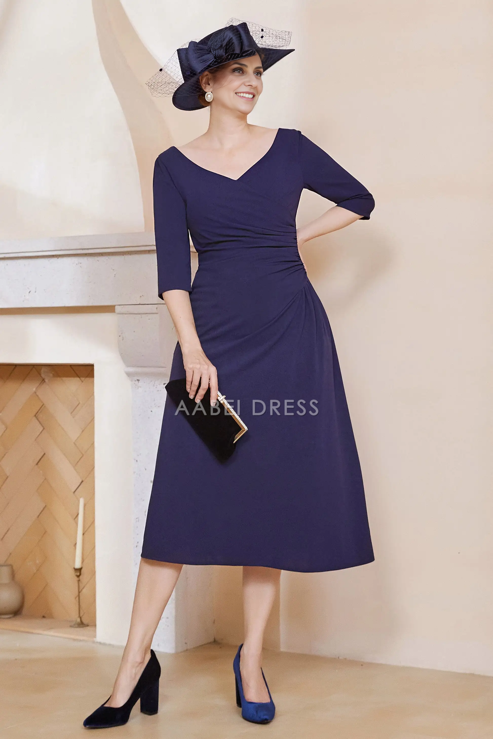 AABEI DRESS Wedding Guests Dresses Mom's Formal Dress A-Line V-neck 3/4 Sleeves Pleated Tea-Length Elegant Simple Mother of the Bride Dress