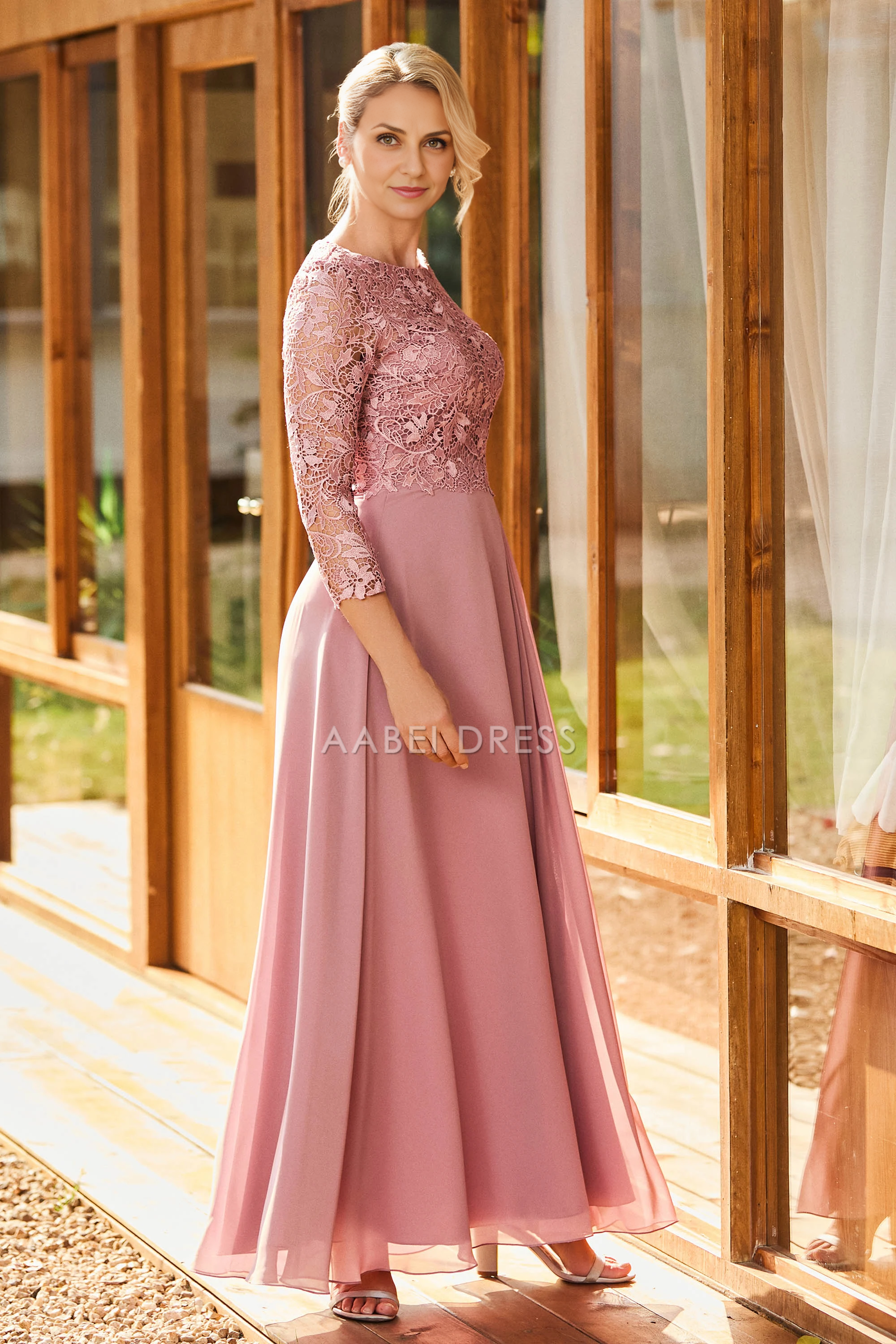 AABEI DRESS Wedding Guests Dresses Mom's Formal Dress Elegant A-Line Scoop Neck Long Sleeves Lace Top Chiffon Floor-Length Dress Exquisite Mother of the Bride Dress