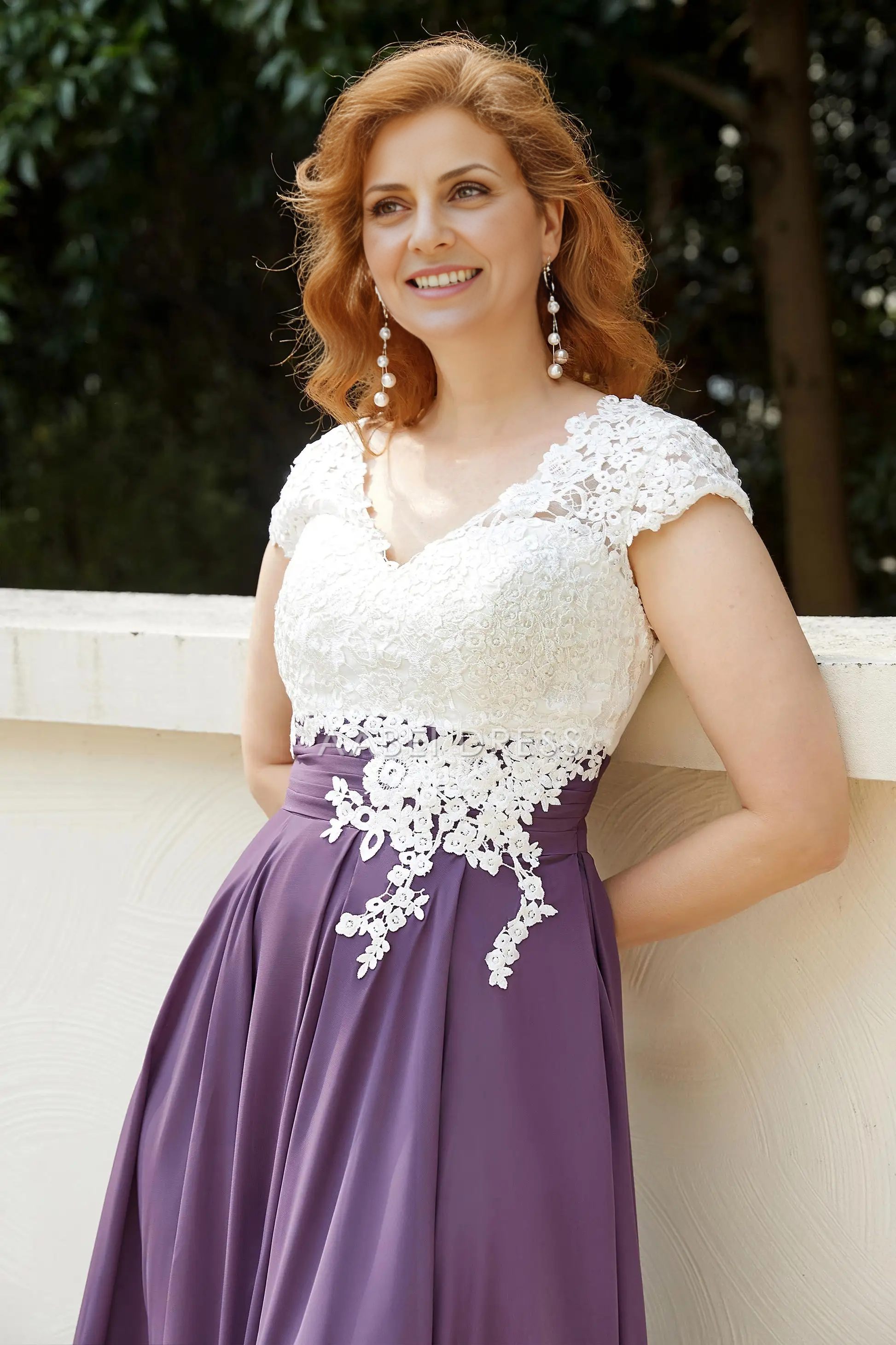AABEI DRESS Wedding Guests Dresses Mom's Formal Dress Elegant A-Line V Neck Cap Sleeves Lace Top Chiffon Ruched Tea-Length Dress Retro Mother of the Bride Dress