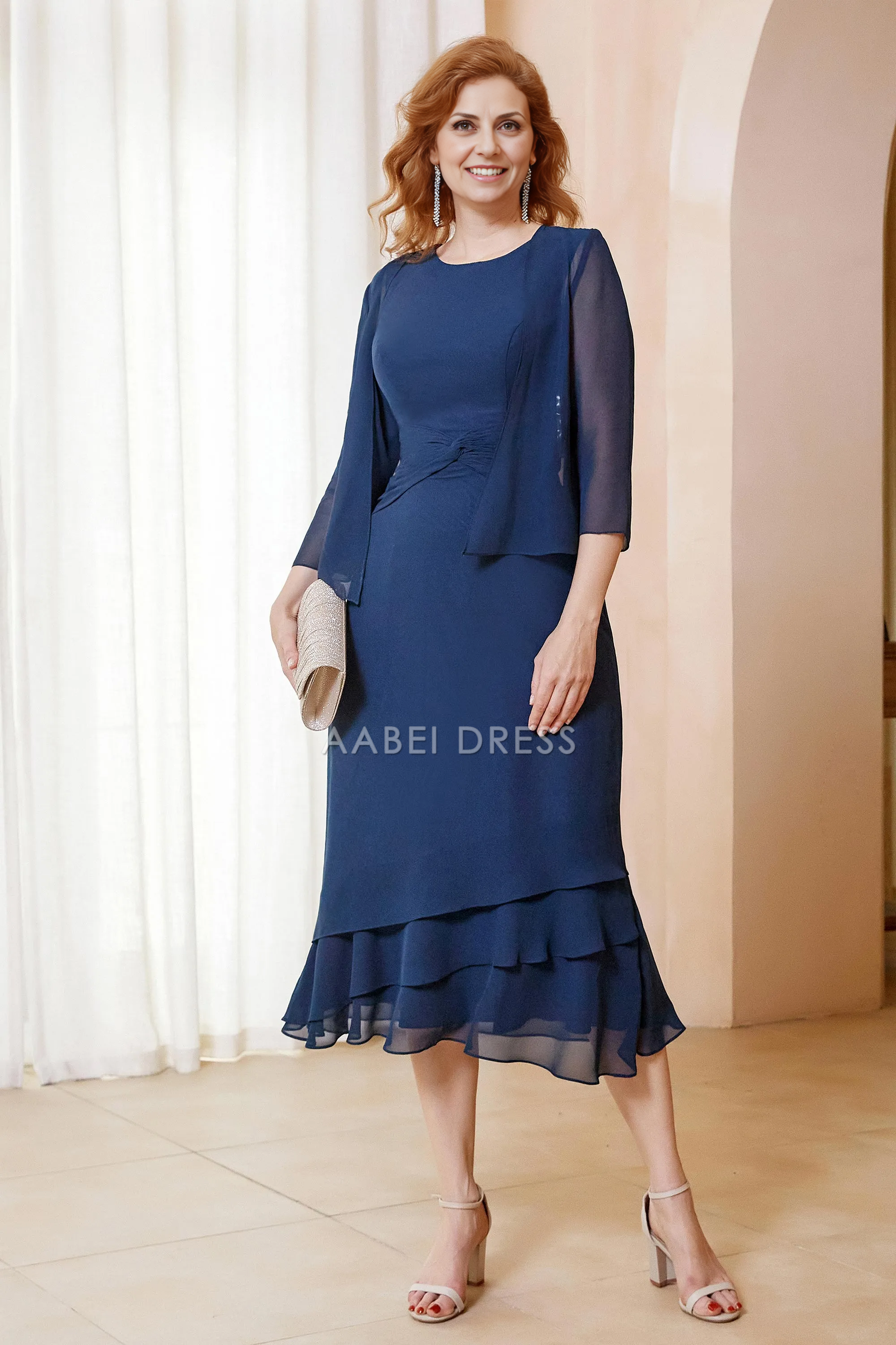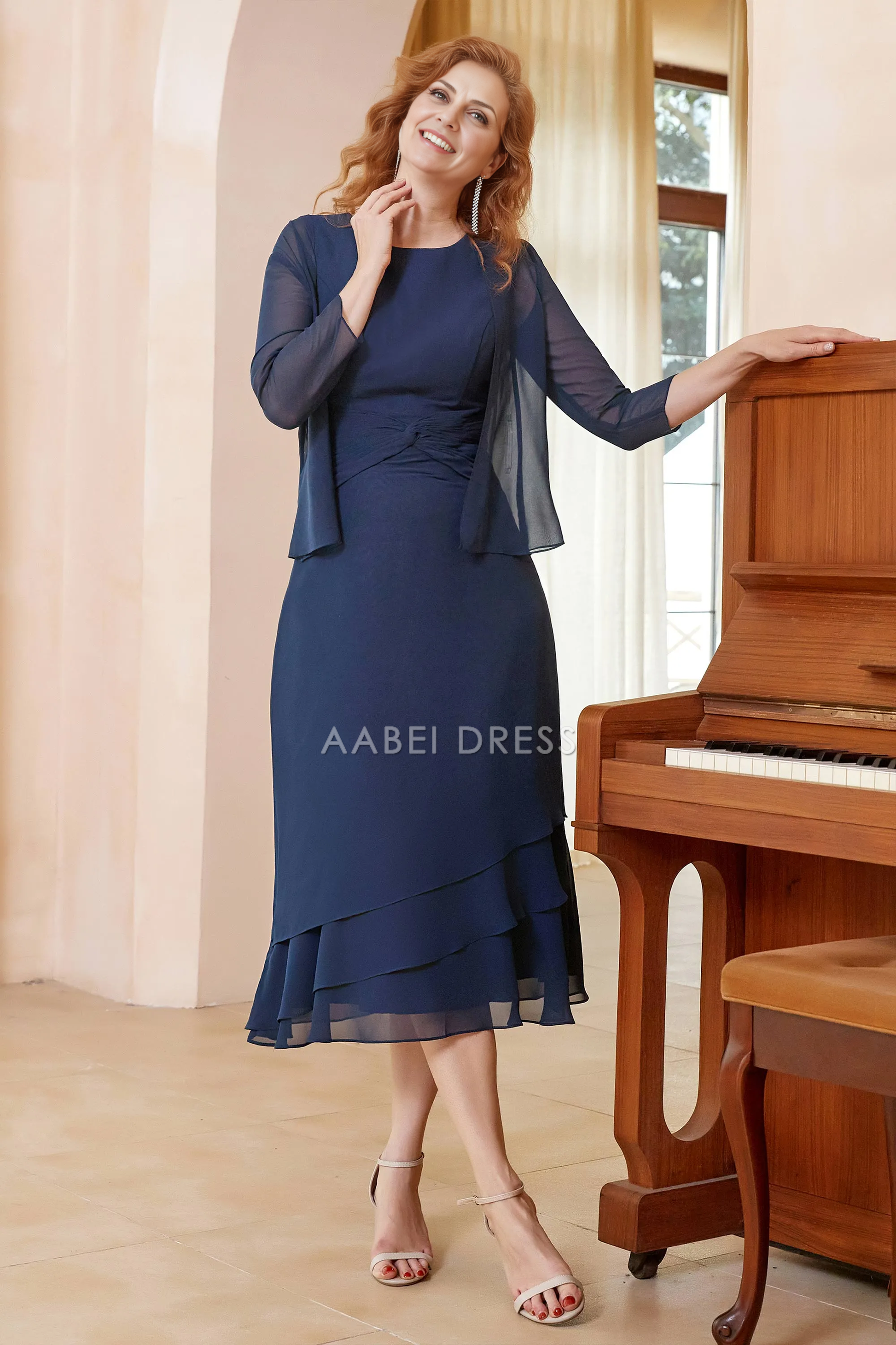AABEI DRESS Wedding Guests Dresses Mom's Formal Dress Sheath Round Neck Long Sleeves Ruffles Chiffon Tea-Length Dress with Jacket Elegant Mother of the Bride Dress