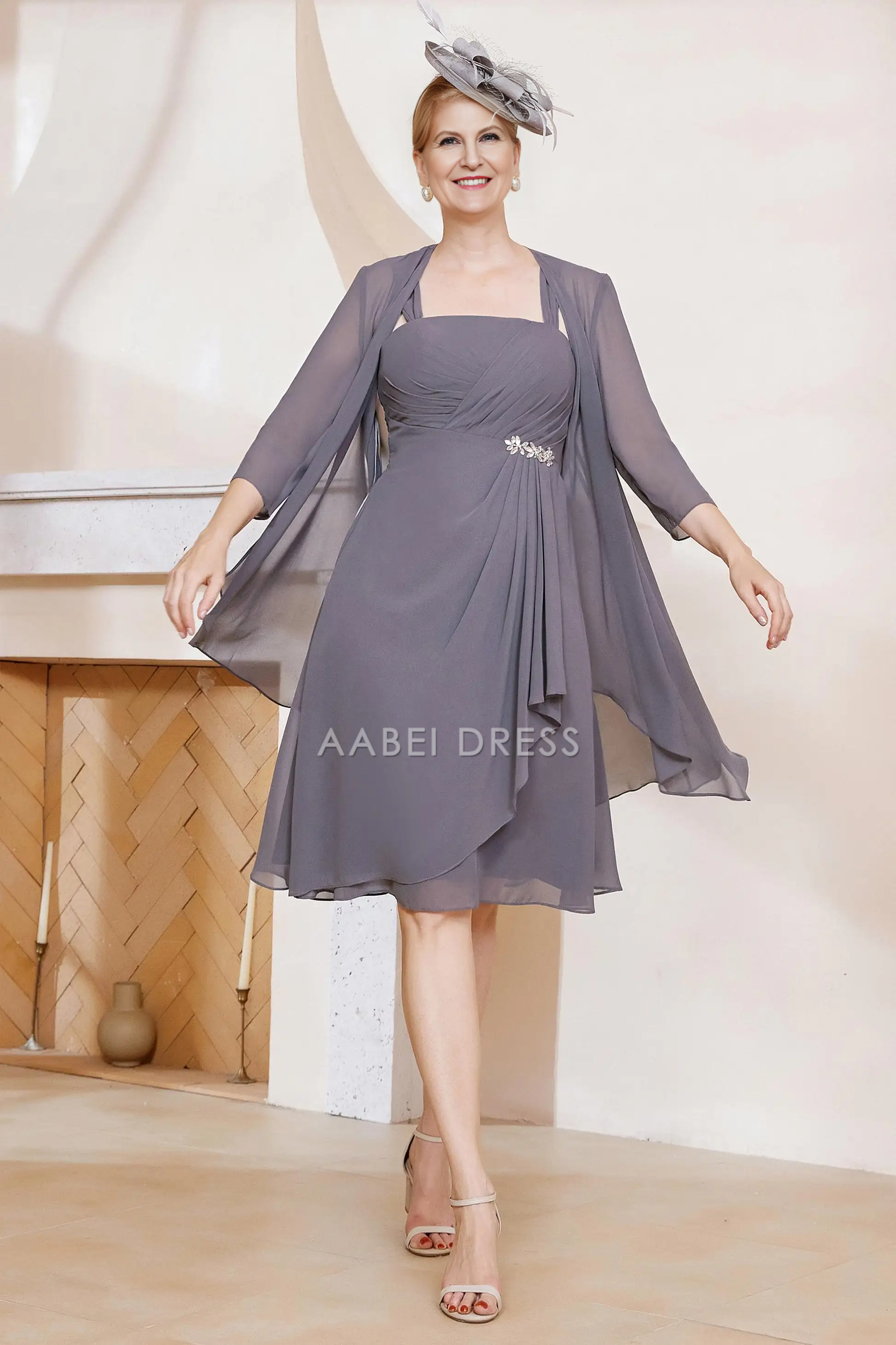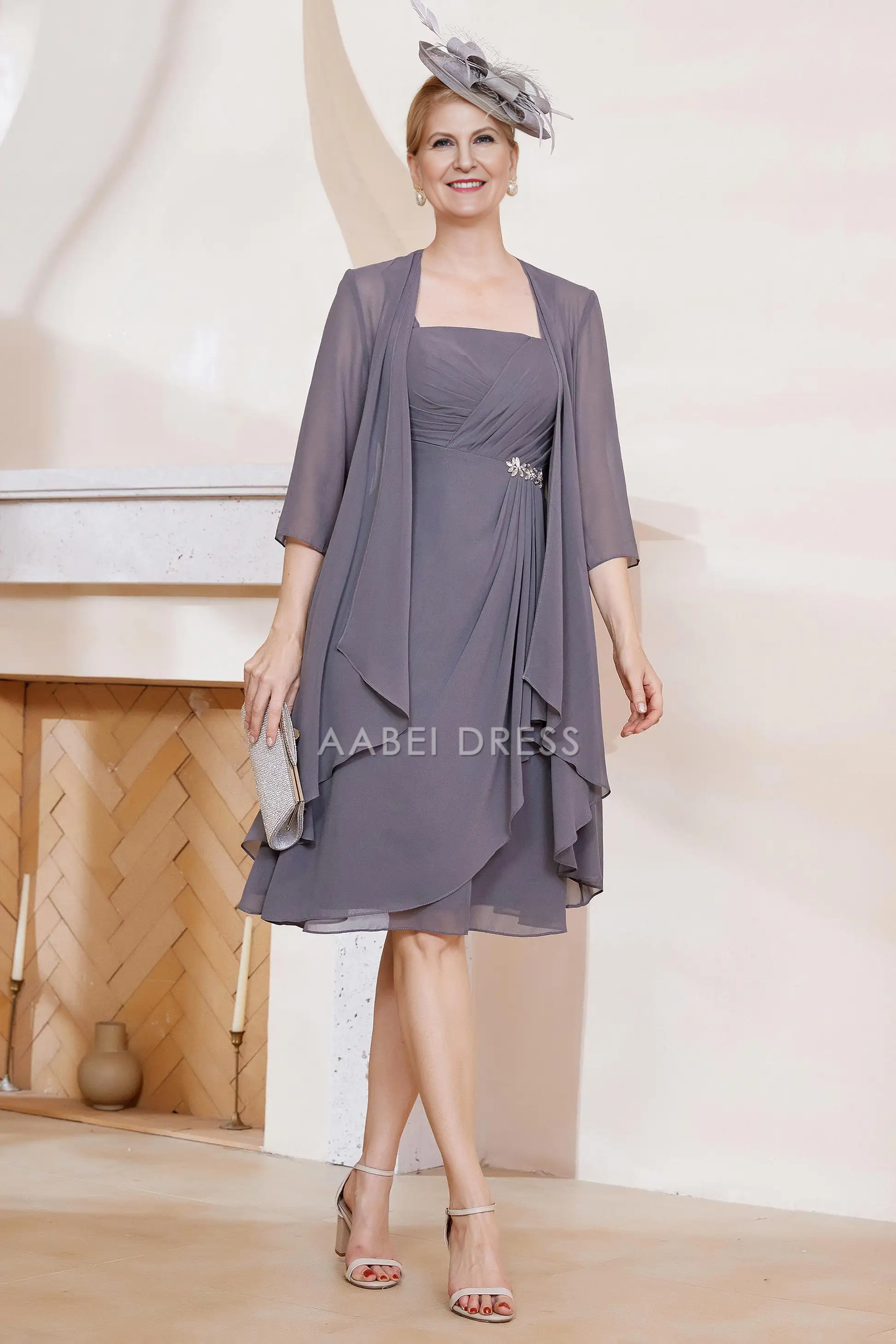 AABEI DRESS Wedding Guests Dresses Mom's Formal Dress Fashion A-Line Square Neck with Jacket 3/4 Sleeves Chiffon Ruched Beadwork Knee-Length Charming Mother of the Bride Dress
