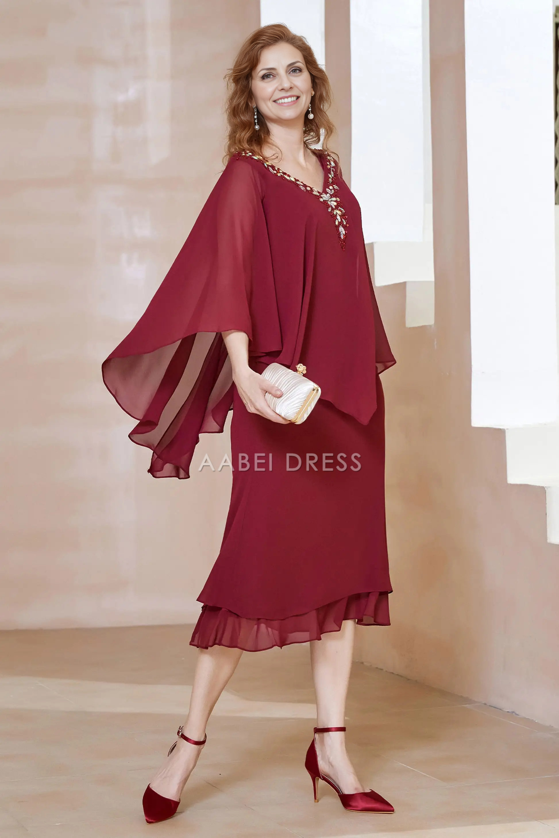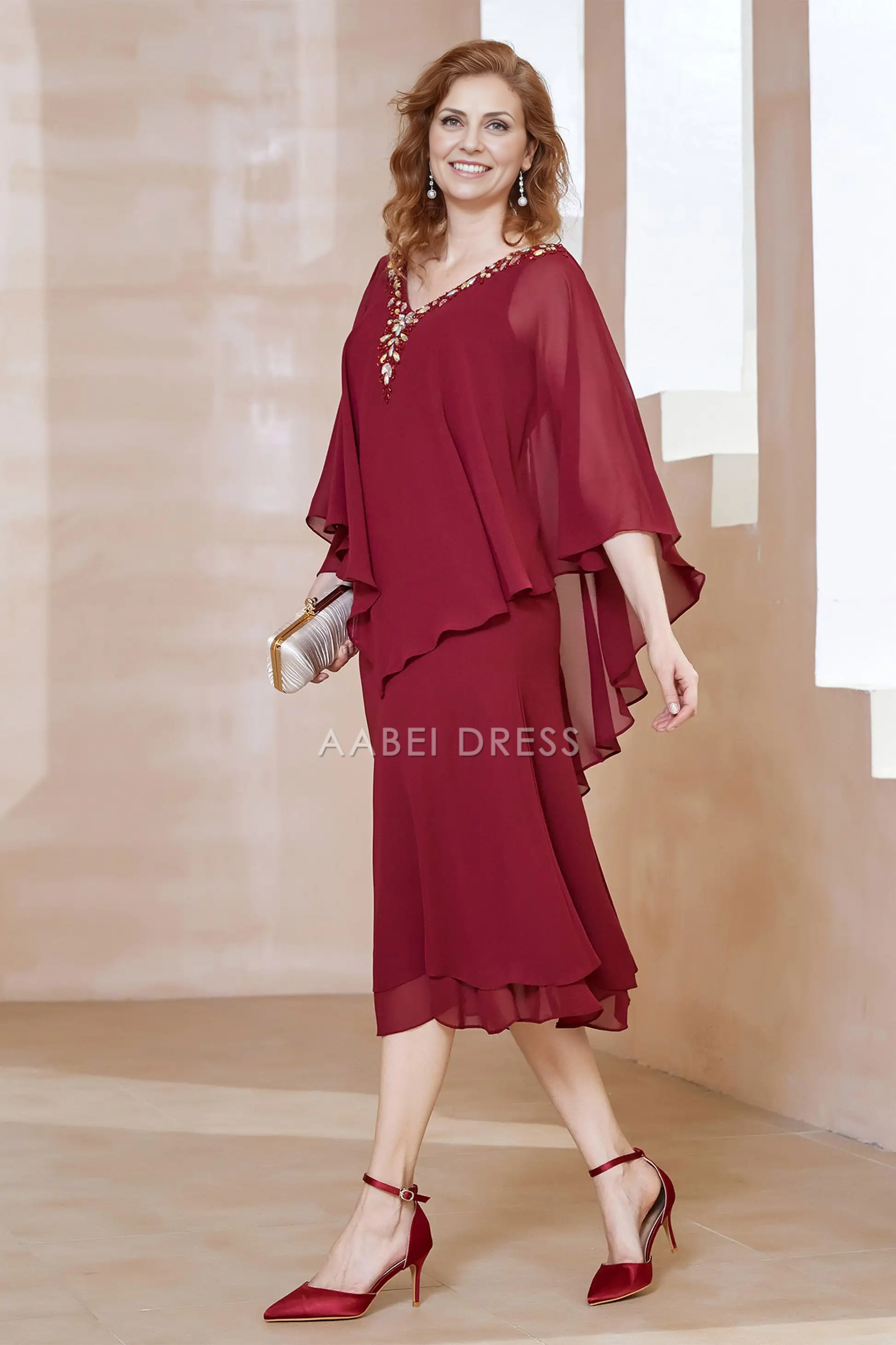 AABEI DRESS Wedding Guests Dresses Mom's Formal Dress Fashion Sheath Beaded V-neck Flutter Sleeves V Back Tea-Length Exquisite Mother of the Bride Dress