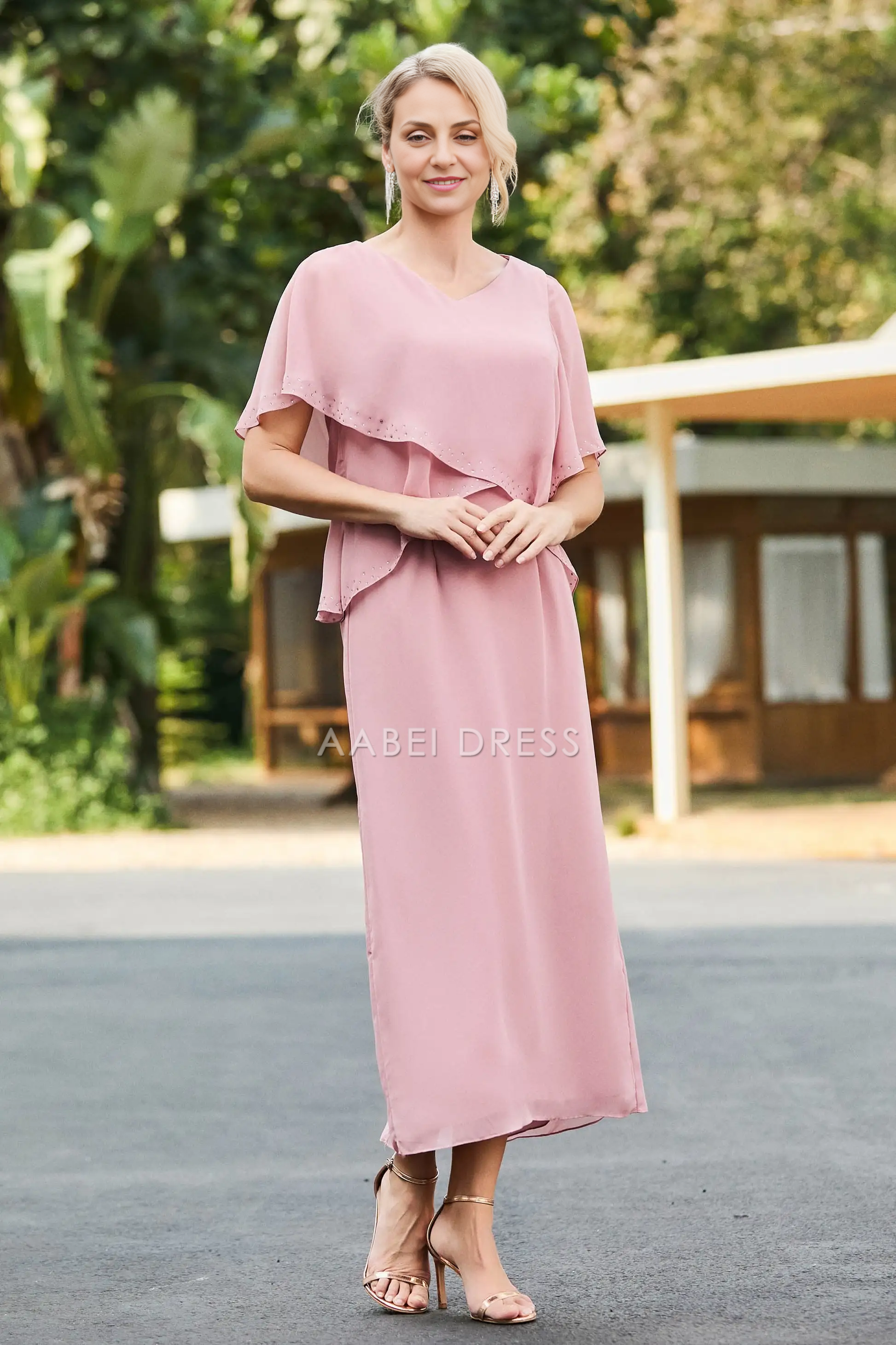 AABEI DRESS Wedding Guests Dresses Mom's Formal Dress Simple Sheath V-Neck Flutter Sleeves Beadwork Back Slit Chiffon Tea-Length Fashion Mother of the Bride Dress
