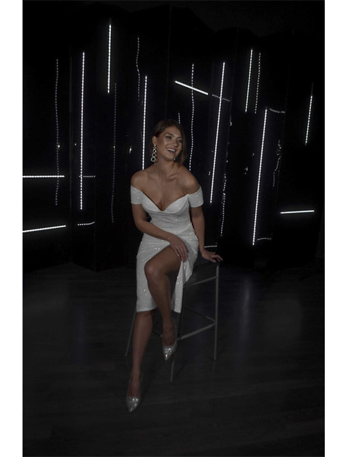 Bachelorette Party Sparkle & Shine Little White Dresses Wedding Dresses Sheath / Column Off Shoulder Cap Sleeve Tea Length Sequined Bridal Gowns With Ruched Split Front