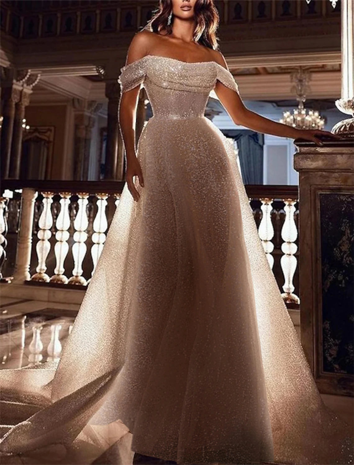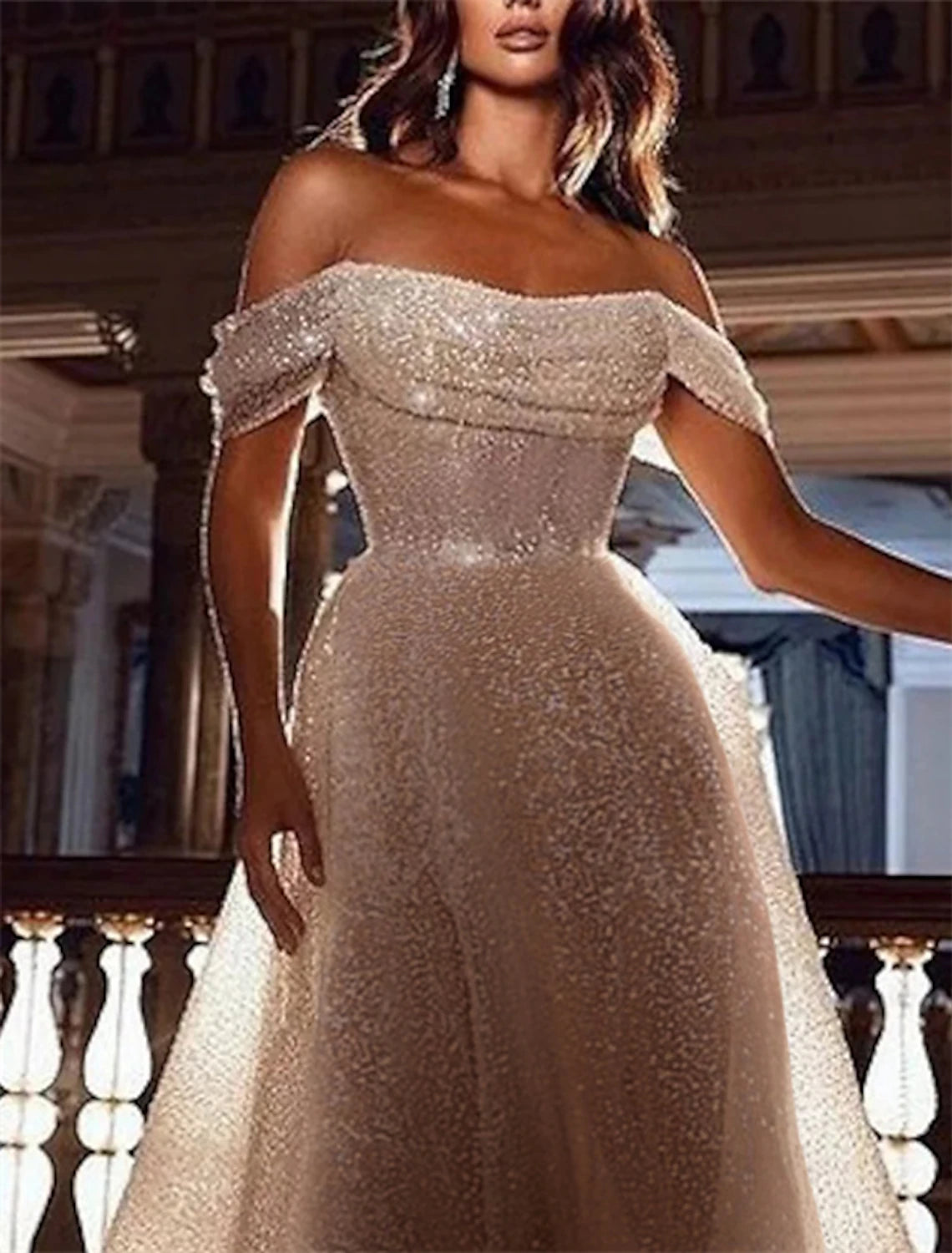 Bachelorette Party Sparkle & Shine Wedding Dresses A-Line Off Shoulder Cap Sleeve Court Train Sequined Bridal Gowns With Solid Color