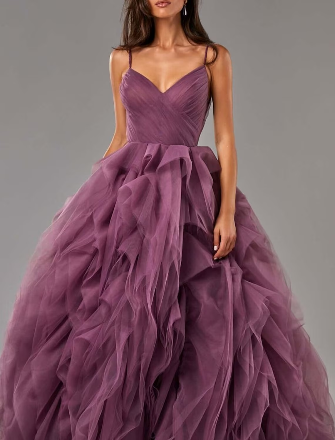 Ball Gown Beautiful Back Elegant Prom Formal Evening Dress V Neck Sleeveless Sweep / Brush Train Tulle with Ruffles Pure Color