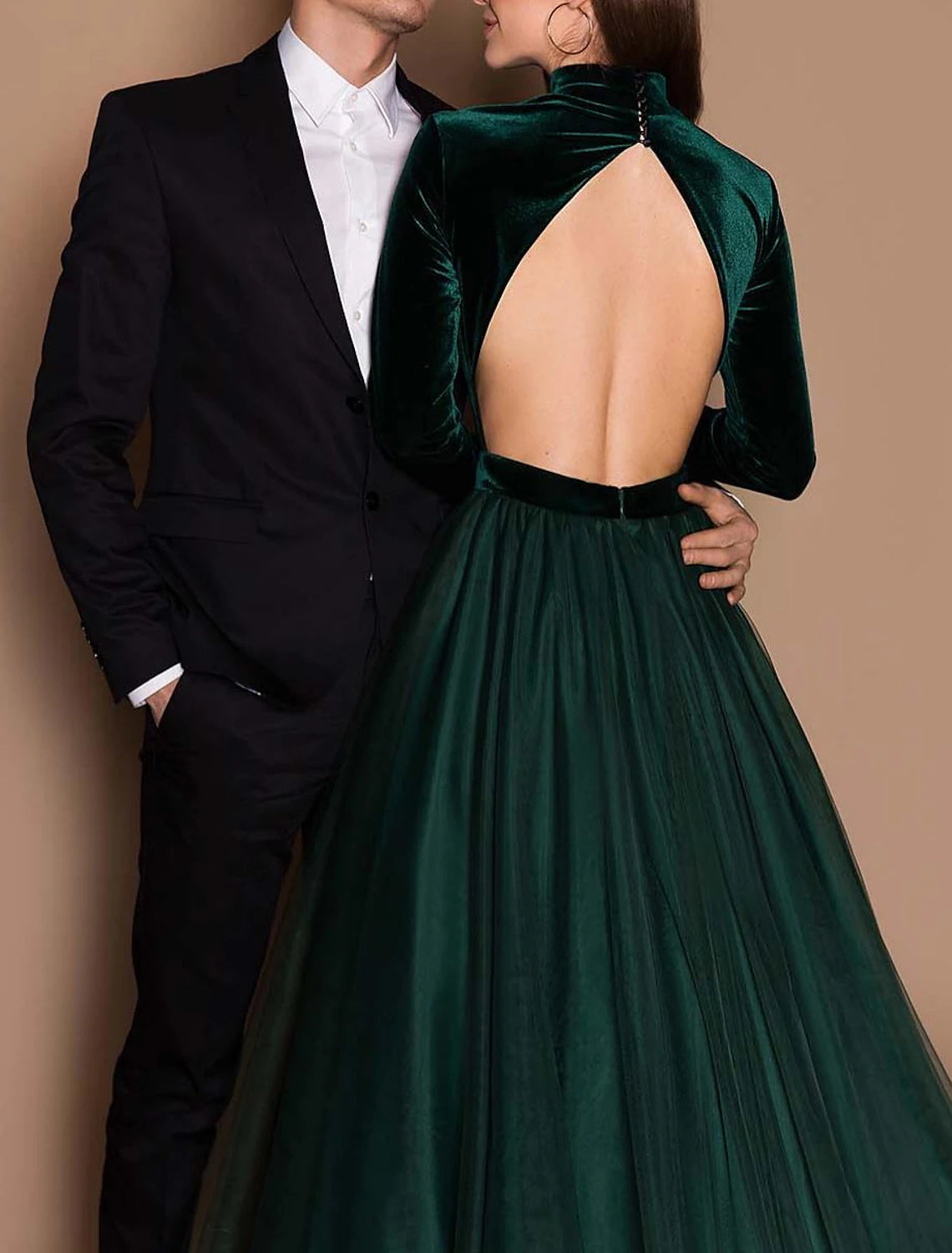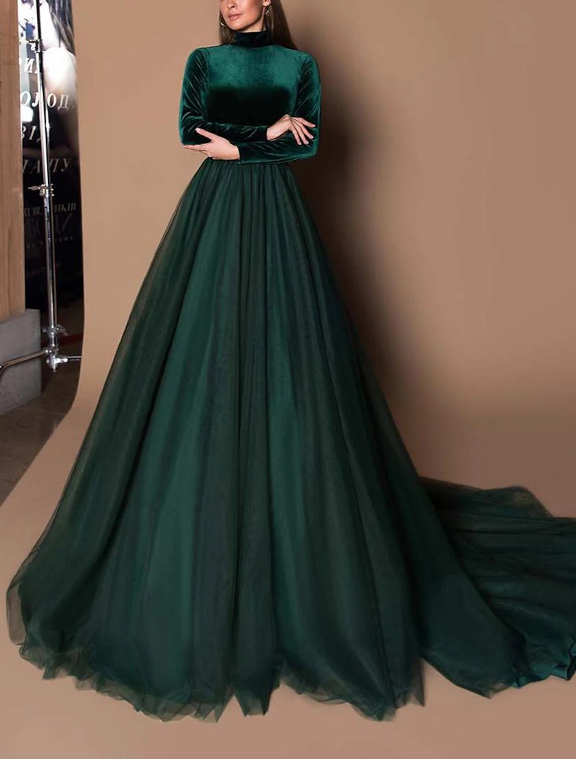 Ball Gown Beautiful Back Elegant Wedding Guest Formal Evening Birthday Dress High Neck Long Sleeve Court Train Tulle with Pleats Pure Color