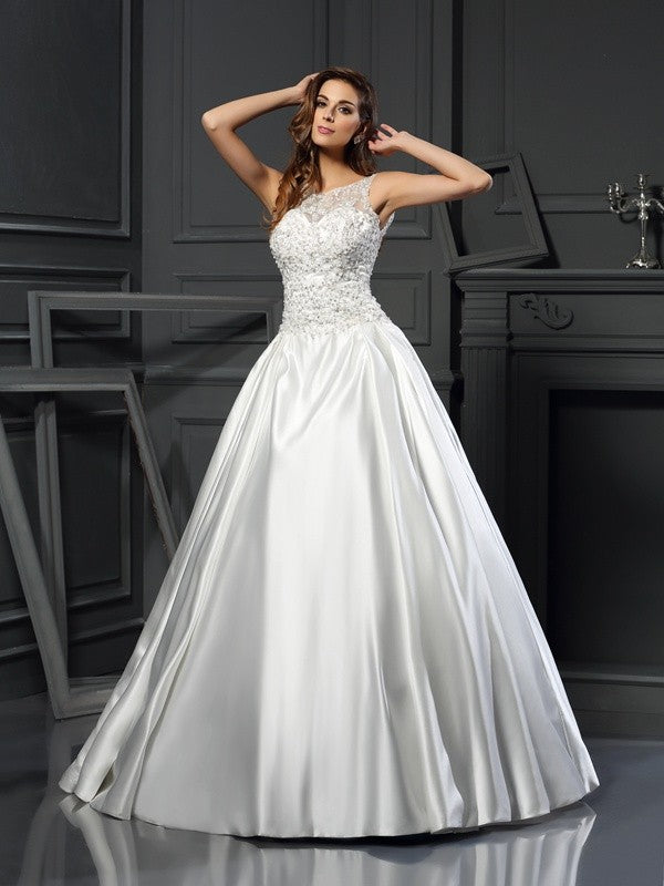 Ball Gown Scoop Applique Sleeveless Long Satin Wedding Dresses