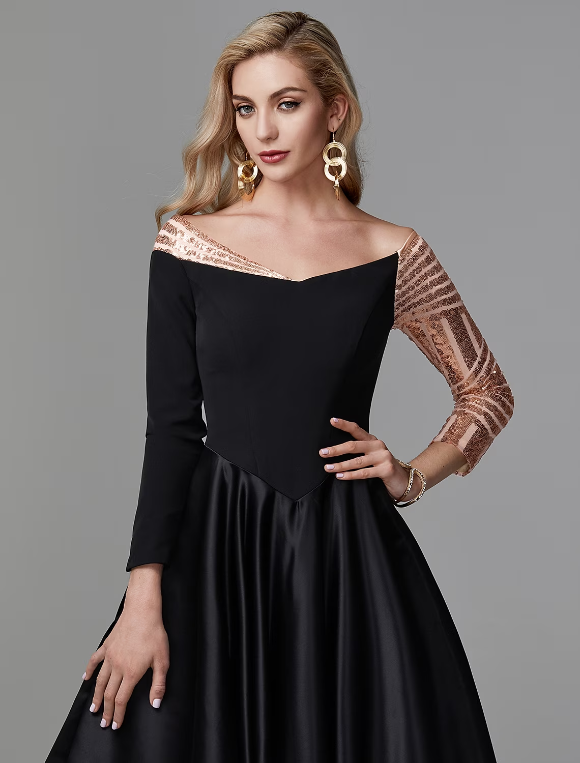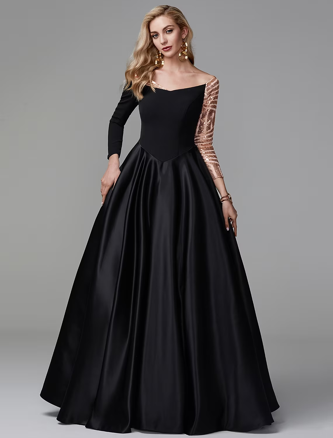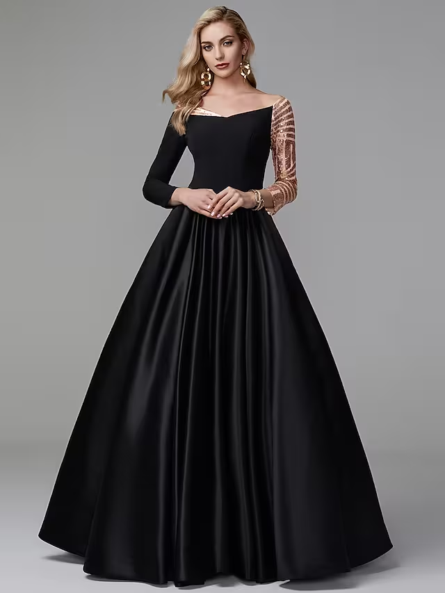 Ball Gown Sparkle Quinceanera Formal Evening Dress Off Shoulder Long Sleeve Floor Length Satin with Sequin