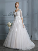 Ball Gown V-neck Court Train 1/2 Sleeves Lace Tulle Wedding Dresses
