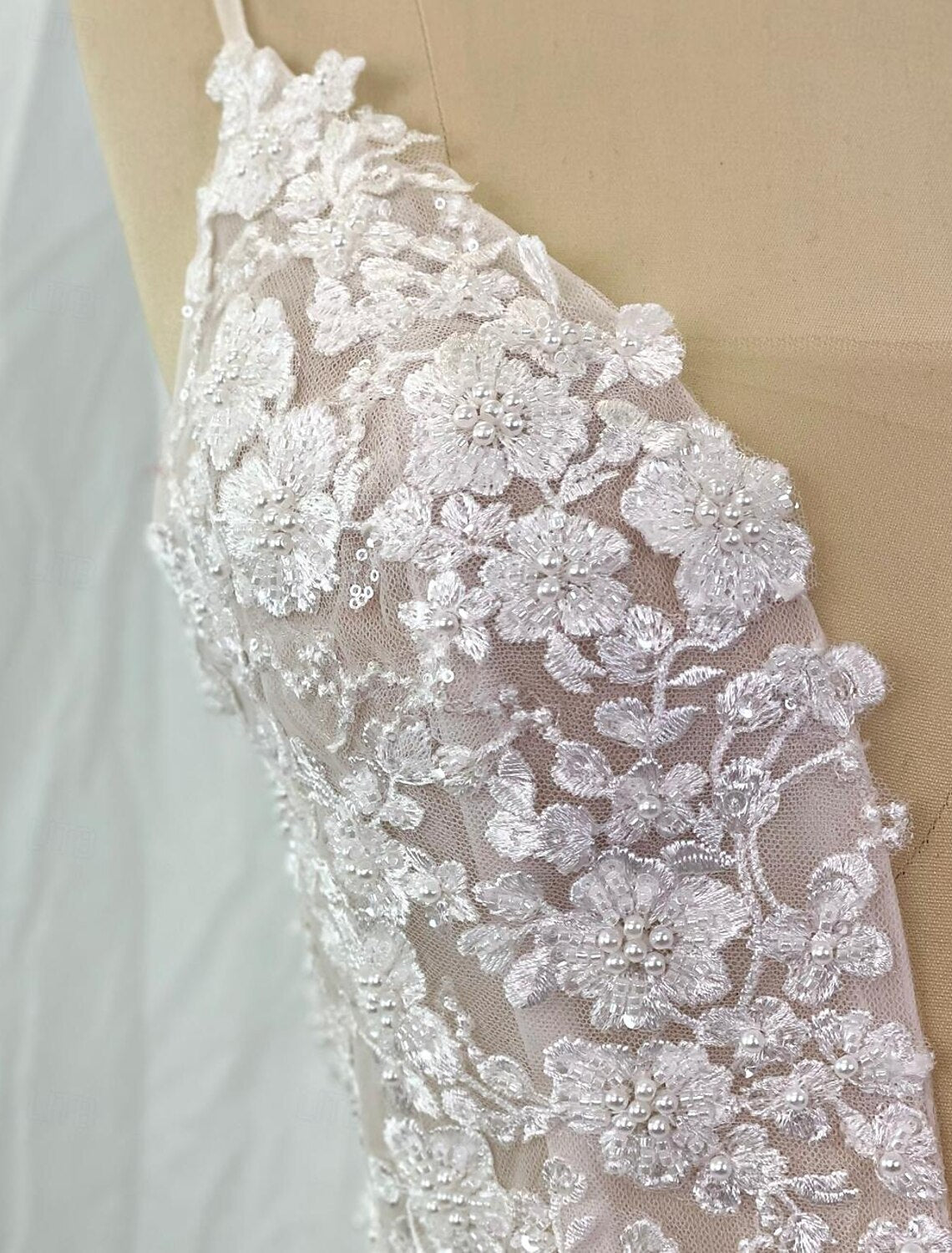 Beach A-Line Camisole V Neck Sleeveless Court Train Tulle Wedding Dresses Bridal Gowns