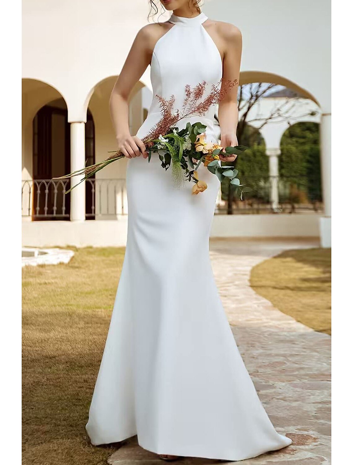 Beach Boho Wedding Dresses Sweep Train Mermaid Halter Sleeveless Stretch Fabric with Solid Color