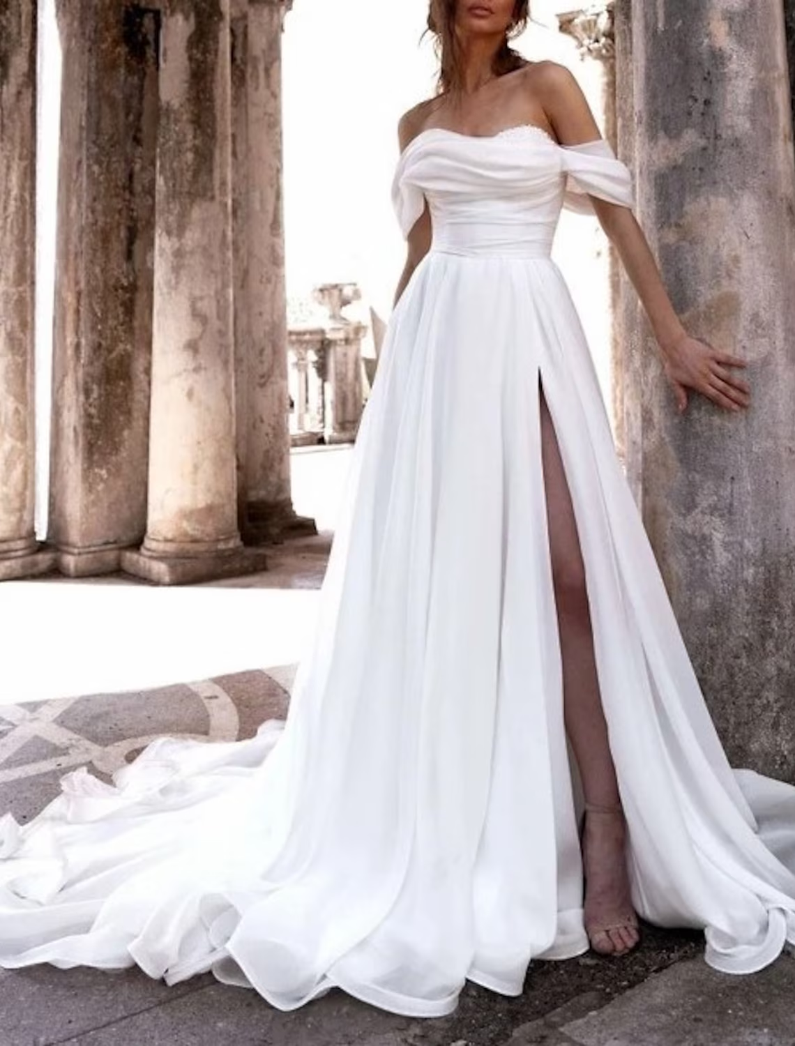 Beach Casual Wedding Dresses Chapel Train A-Line Sleeveless Off Shoulder Chiffon With Ruched Split Front