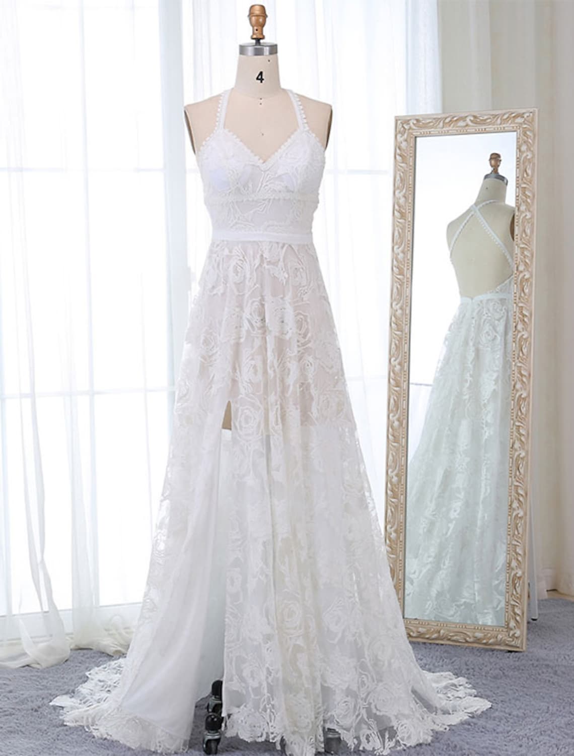 Beach Open Back Boho Wedding Dresses Court Train A-Line Sleeveless Spaghetti Strap V Neck Lace With Appliques