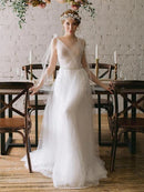 Beach V Neck A Line Tulle With Pearls Court Wedding Dresses