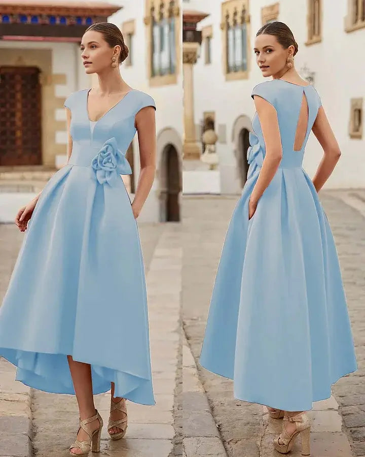 Elegant Formal Women's Dresses A Line V Neck Cap Sleeve Three-Dimensional Flower Hi-Lo Irregular hem Keyhole Back Affordable Prom Dress